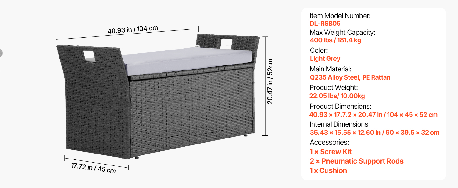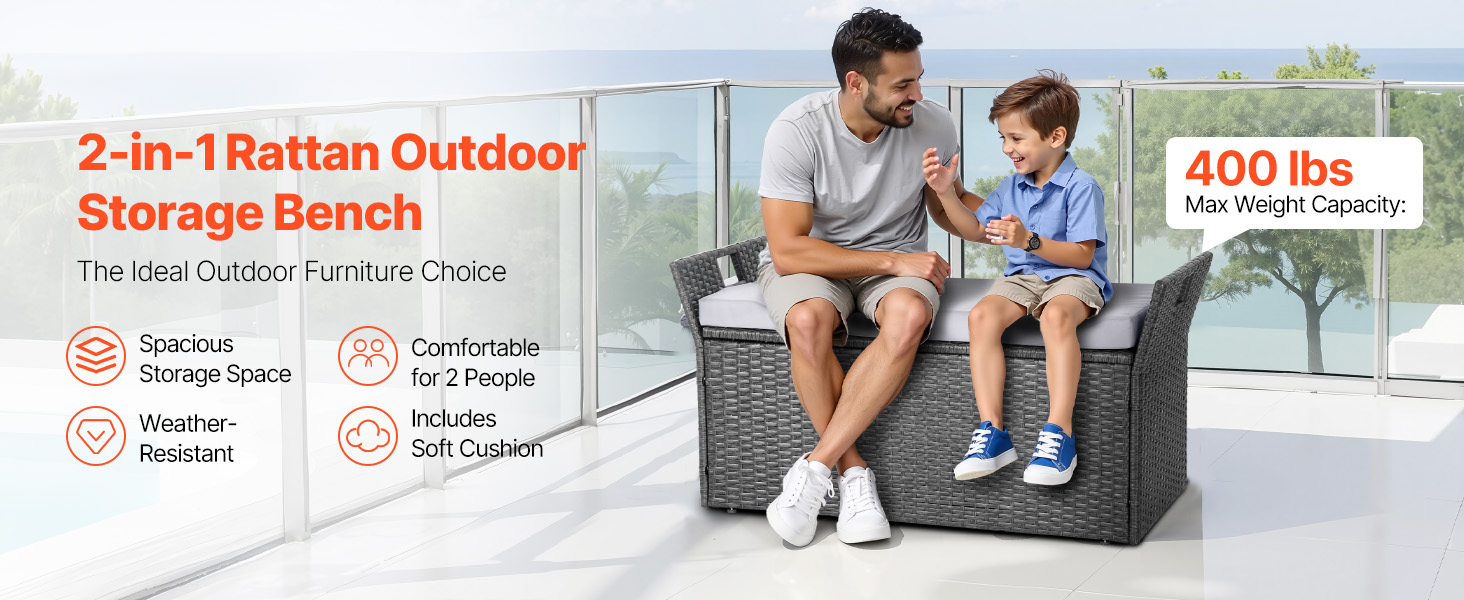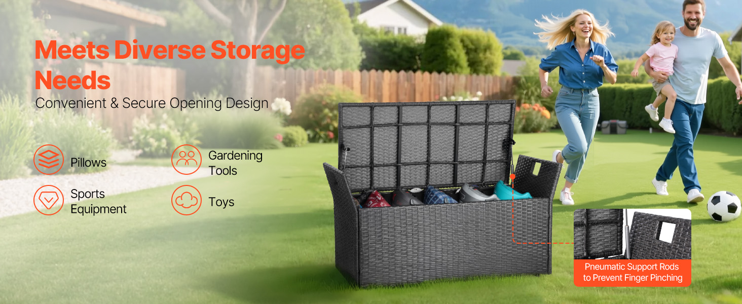 Vonkajšia lavica s úložným priestorom je vybavená pneumatickou opornou tyčou pre bezpečný a ľahký prístup do úložného priestoru. S vnútornými rozmermi 15,7 × 35 × 13 palcov poskytuje dostatok priestoru na vankúše, záhradné náradie, športové vybavenie a hračky, čím udržiava vaše vonkajšie potreby upratané.