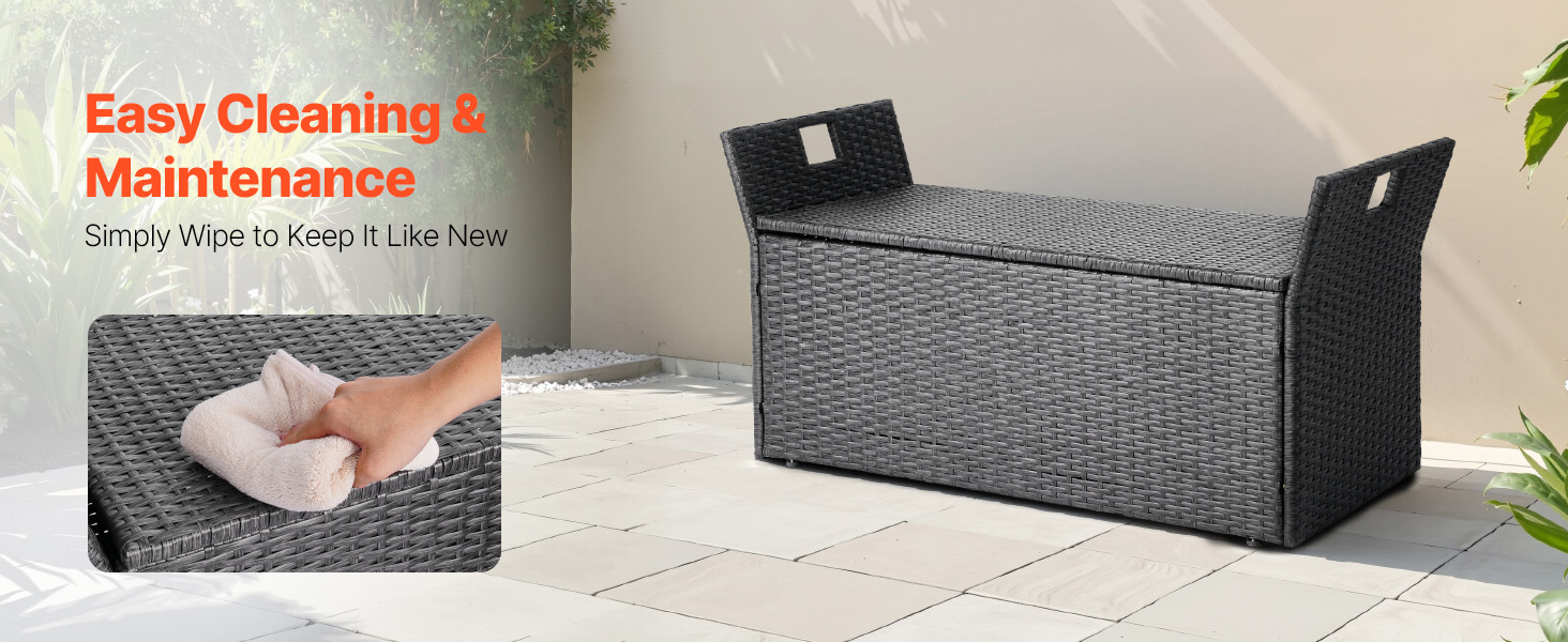 Lavička s úložným priestorom je vyrobená z vysoko kvalitného kovu a PE prútia a je odolná voči vyblednutiu a praskaniu. Jej povrch sa ľahko čistí vlhkou handričkou, vyžaduje minimálnu údržbu a zachováva čistý a uprataný vzhľad.