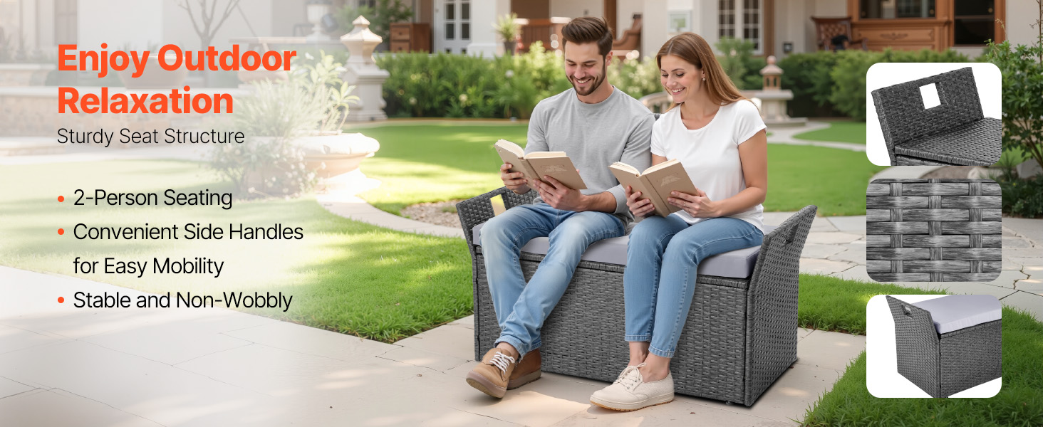 Táto vonkajšia úložná lavica s vnútorným priestorom 15,7 × 35 × 13 palcov slúži ako pohodlné sedenie pre dvoch a úložný priestor pre vonkajšie potreby, vďaka čomu je váš priestor uprataný. Je vyrobená z pevného rámu z legovanej ocele, ktorý unesie až 400 libier, a z odolného PE prútia, ktoré odoláva slnku, dažďu a vyblednutiu.