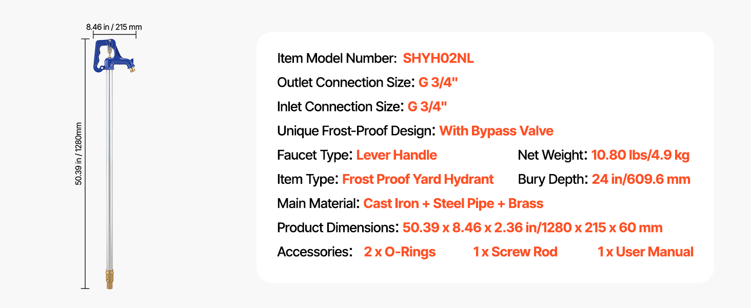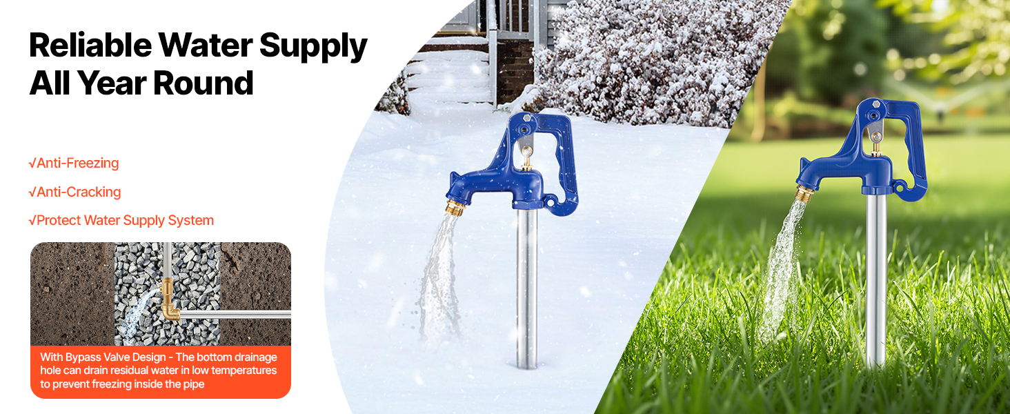 Dvorný mrazuvzdorný hydrant VEVOR má celkovú dĺžku 4,2FT (1280 mm), hĺbku zakopania 24 palcov a konštrukciu obtokového ventilu, vďaka ktorej voda plynule prúdi aj v mrazivých podmienkach. Odolná konštrukcia znižuje únik vody a zaručuje trvanlivosť, je ideálny na zavlažovanie záhrady, čistenie auta a zavlažovanie farmy.