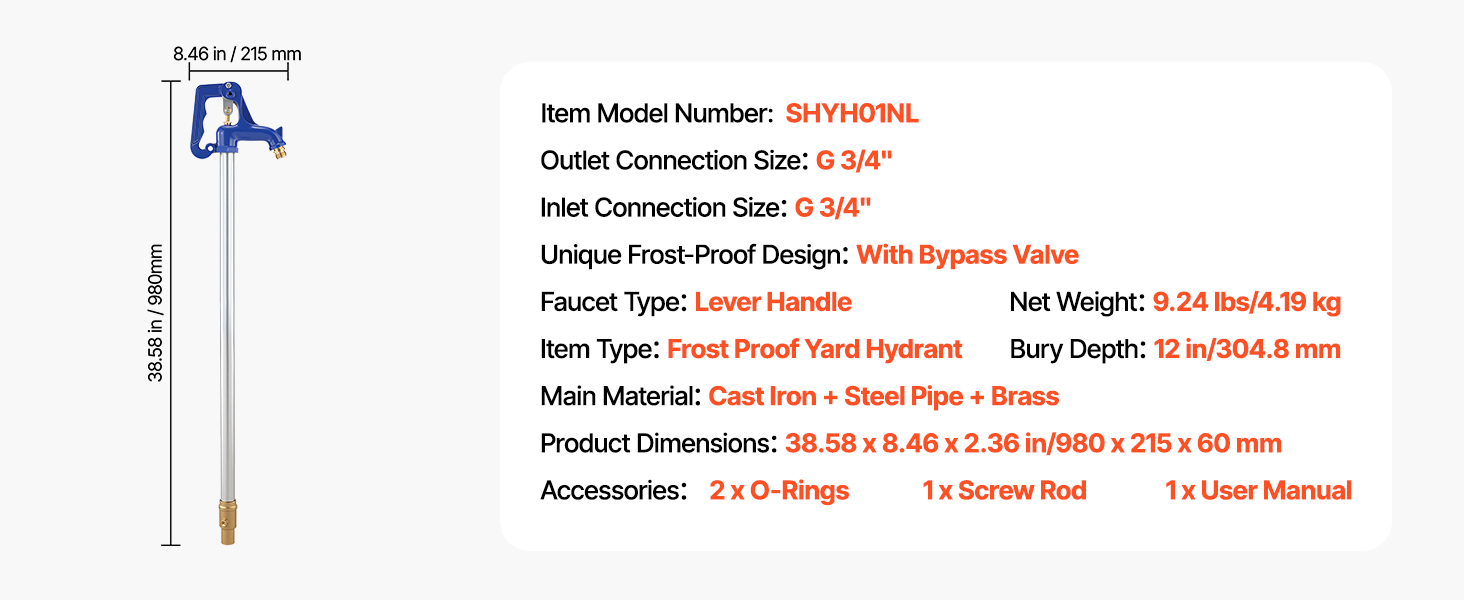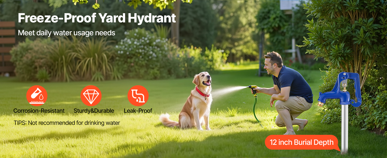 Dvorný mrazuvzdorný hydrant VEVOR má celkovú dĺžku 3,22FT (980 mm), hĺbku zakopania 12 palcov a konštrukciu obtokového ventilu, vďaka ktorej voda plynule prúdi aj v mrazivých podmienkach. Odolná konštrukcia znižuje únik vody a zaručuje trvanlivosť, je ideálny na zavlažovanie záhrady, čistenie auta a zavlažovanie farmy.
