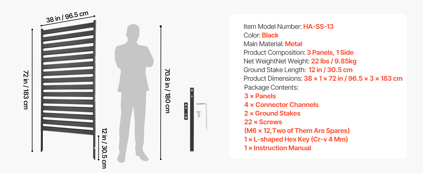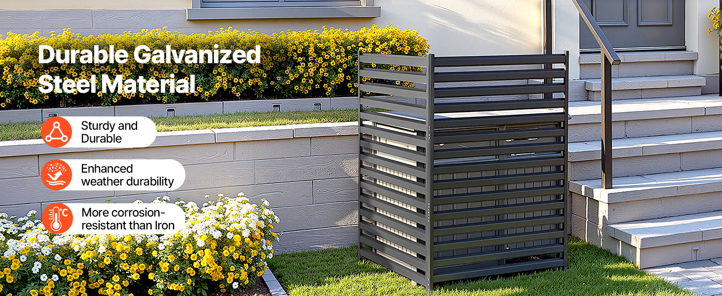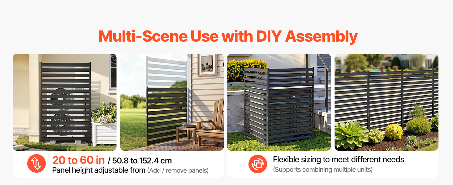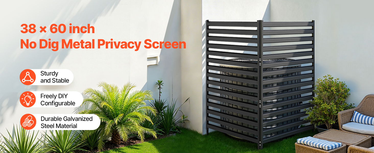 Táto kovová clona na ochranu súkromia s rozmermi 38 x 60 palcov/96 x 152,4 cm, navrhnutá s ohľadom na funkčnosť aj vzhľad, sa výborne hodí na ohraničenie vonkajších priestorov alebo zakrytie klimatizačných jednotiek. Je vyrobená z odolného kovu so stabilnou konštrukciou a spája v sebe elegantný dizajn s univerzálnym využitím vo vonkajšom prostredí.