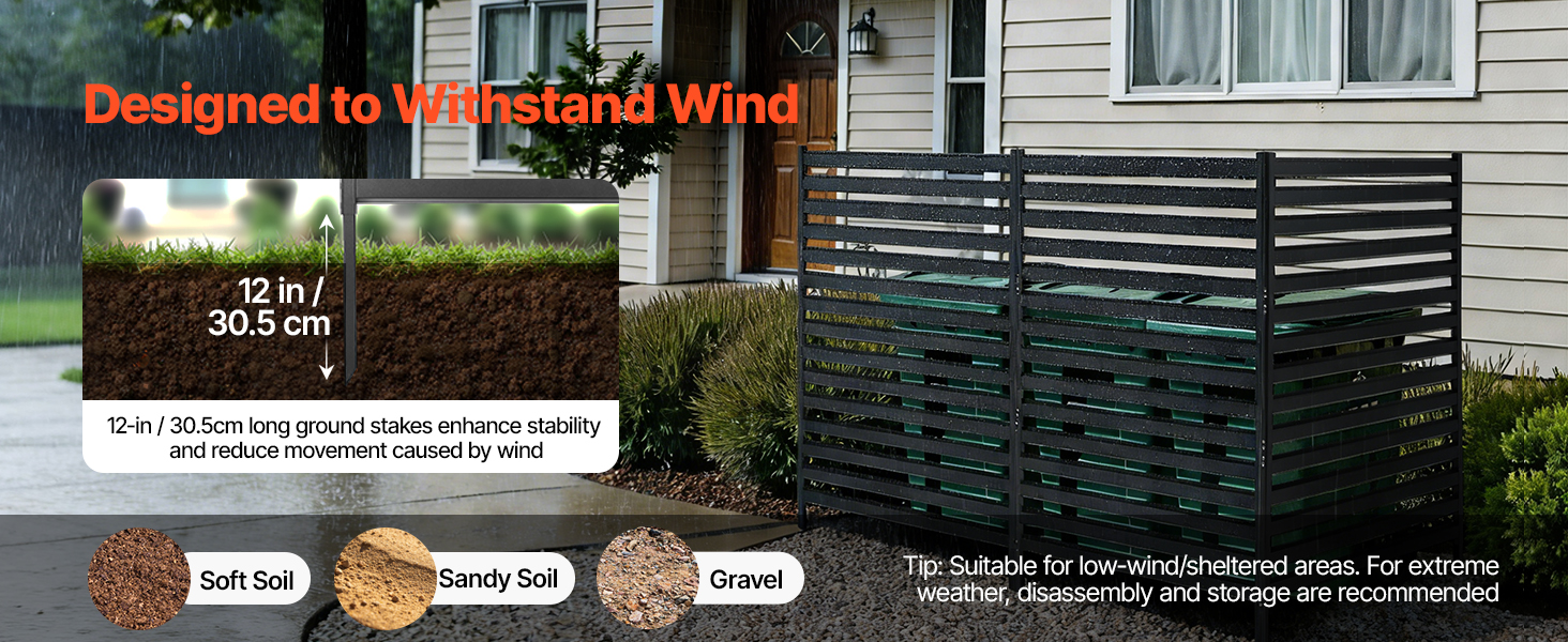 Tento kovový panel na ochranu súkromia je navrhnutý tak, aby pevne držal na mieste, a obsahuje predĺžené zemné kolíky s dĺžkou 12 palcov (30,5 cm) pre silnejšiu oporu proti vetru. V kombinácii s pevnou kovovou konštrukciou zostáva stabilný aj pri dlhodobom vonkajšom používaní bez uvoľnenia alebo straty pôvodného tvaru.