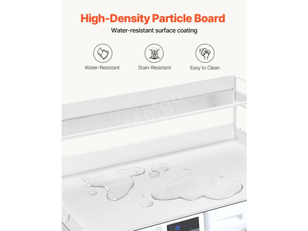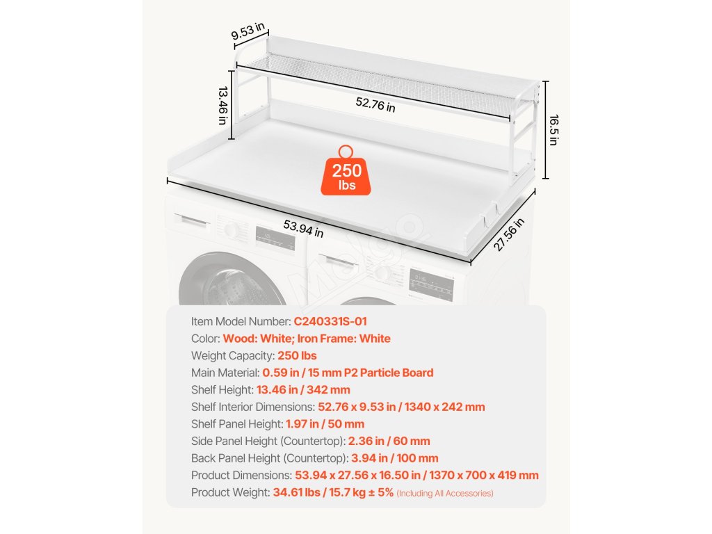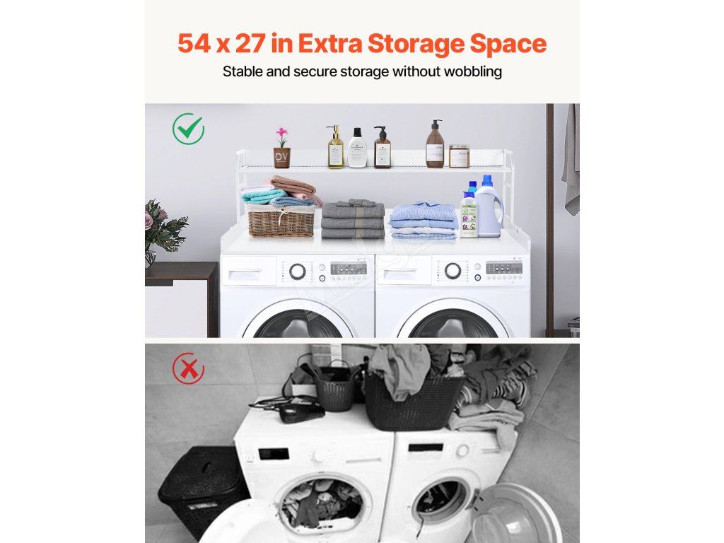 Táto pracovná doska pre práčku a sušičku má šírku 54 palcov a hĺbku 27 palcov, čím poskytuje priestrannú pracovnú plochu pre vašu práčovňu. Či už skladáte oblečenie, triediť veci alebo skladujete príslušenstvo na pranie, táto veľká plocha splní všetky vaše potreby.