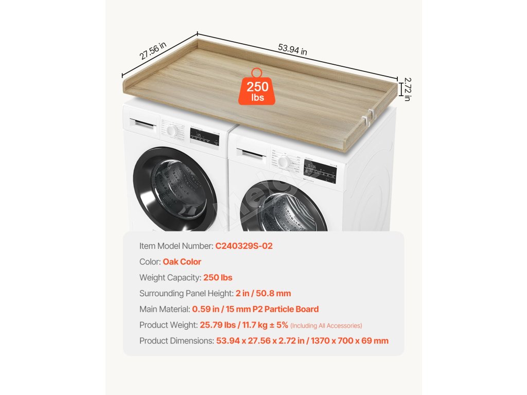 Táto pracovná doska na práčku a sušičku je široká 54 palcov a hlboká 27 palcov, čím poskytuje priestrannú pracovnú plochu pre vašu práčovňu. Či už skladáte oblečenie, triedite veci alebo ukladáte pracie potreby, táto veľká plocha splní všetky vaše potreby.