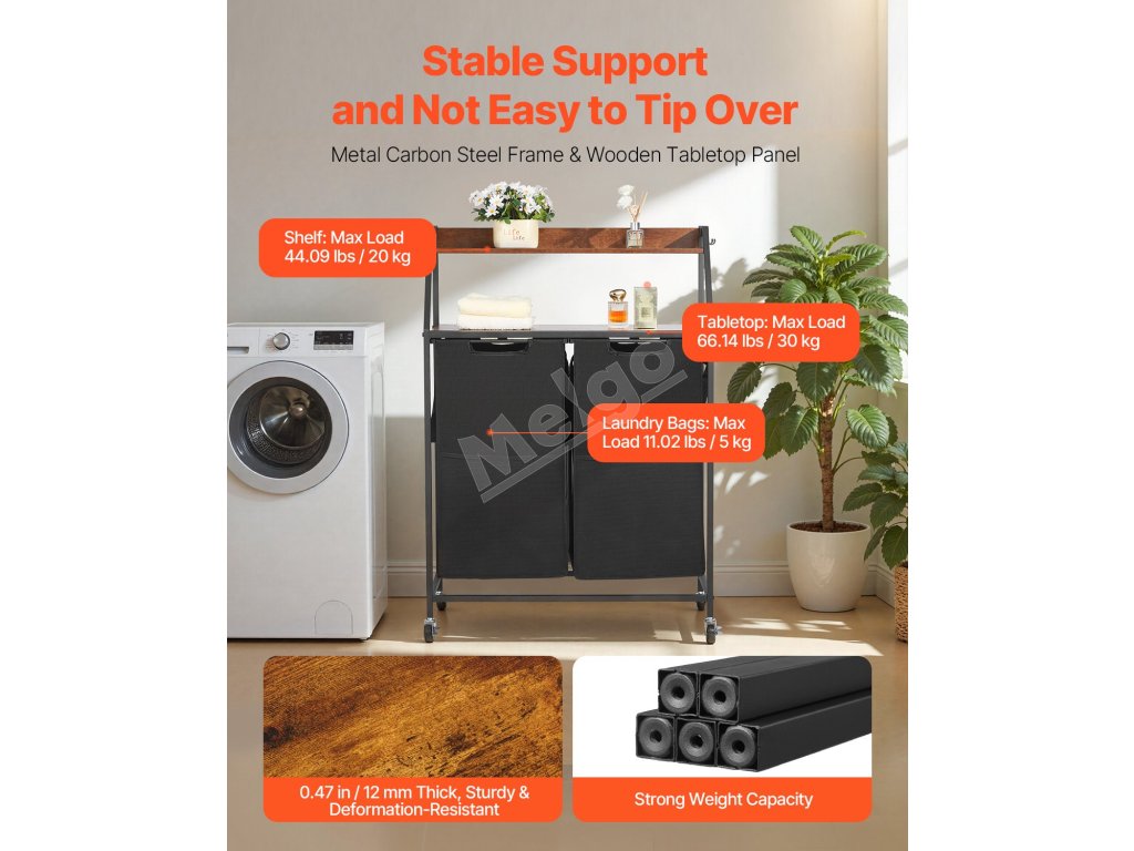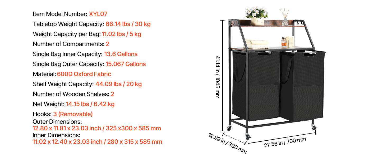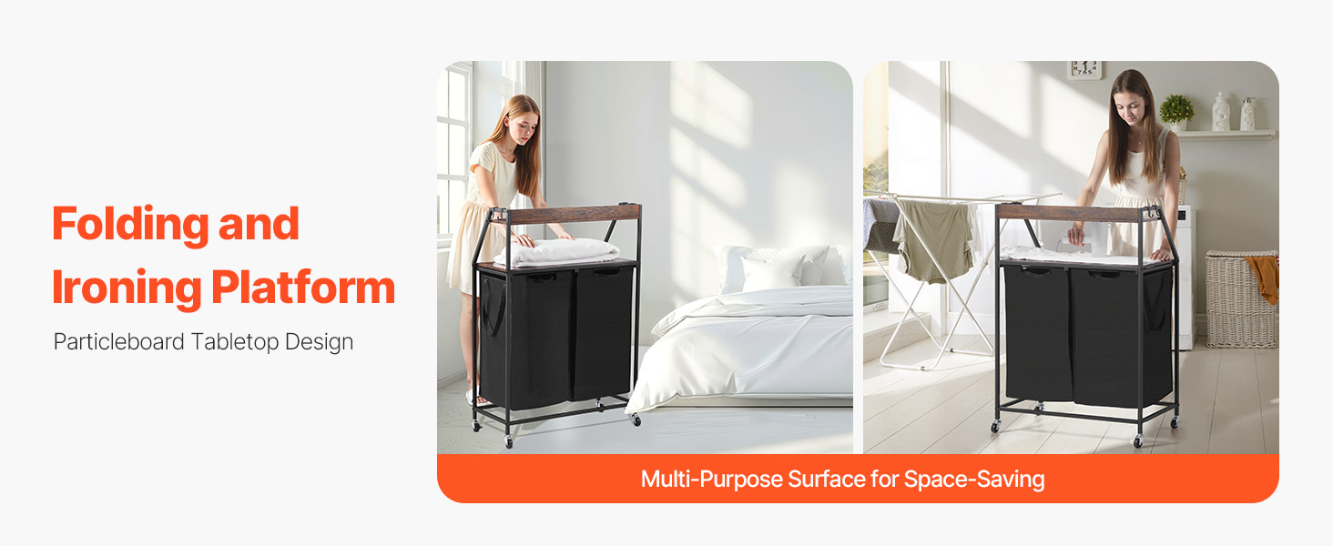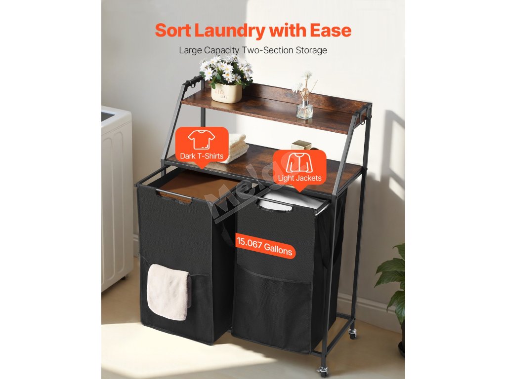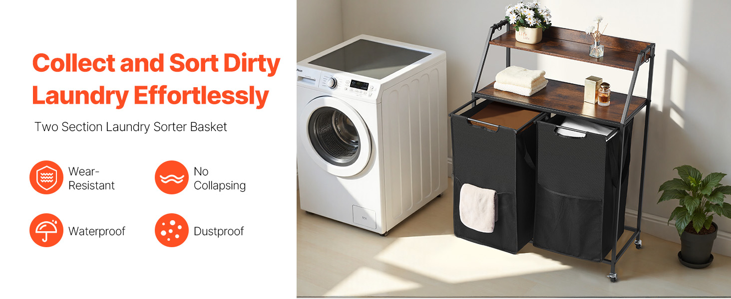 Dve priehradky s objemom 30,14 litra, vyrobené z odolnej, nepremokavej a proti prehýbaniu odolnej tkaniny - ideálne na triedenie svetlého/čierneho, mokrého/suchého alebo oblečenia pre dospelých/deti, aby ste mali doma čisto a usporiadane.