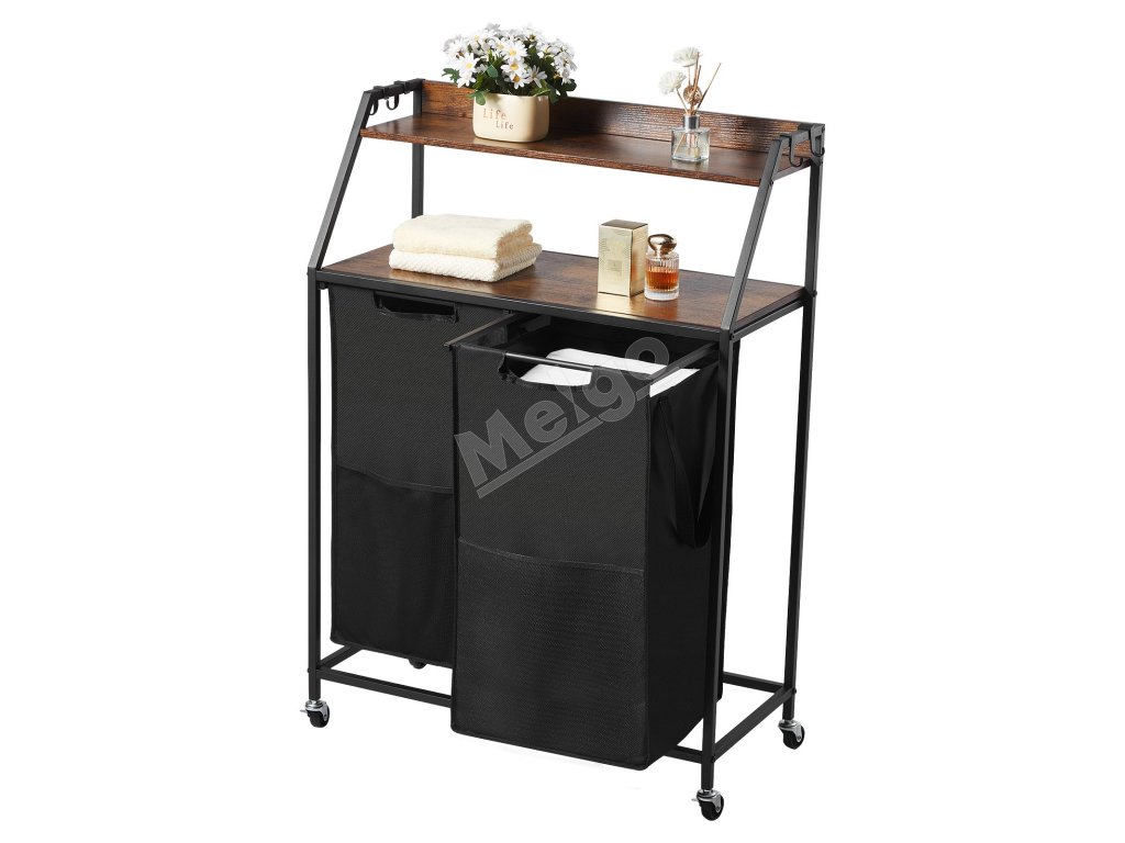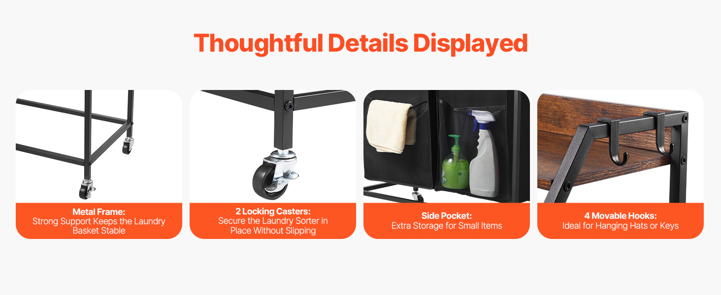 Náš triedič bielizne má vystužený kovový rám, ktorý poskytuje stabilnú oporu. Nastaviteľné nožičky vyhovujú rôznym typom podláh, zatiaľ čo dvojité blokovacie kolieska udržia kôš bezpečne na mieste. Dodáva sa s odnímateľným háčikom a bočným vreckom, na jednoduché uloženie kľúčov, čiapok a ponožiek.