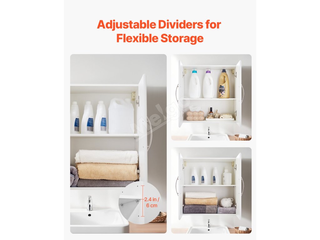 Nástenná skrinka na bielizeň je vybavená nastaviteľnými policami s 3 výškovými nastaveniami, ktoré umožňujú prispôsobiť úložný priestor na základe veľkosti položiek, ako sú pracie prostriedky a uteráky, a maximalizovať tak dostupný priestor skrinky.