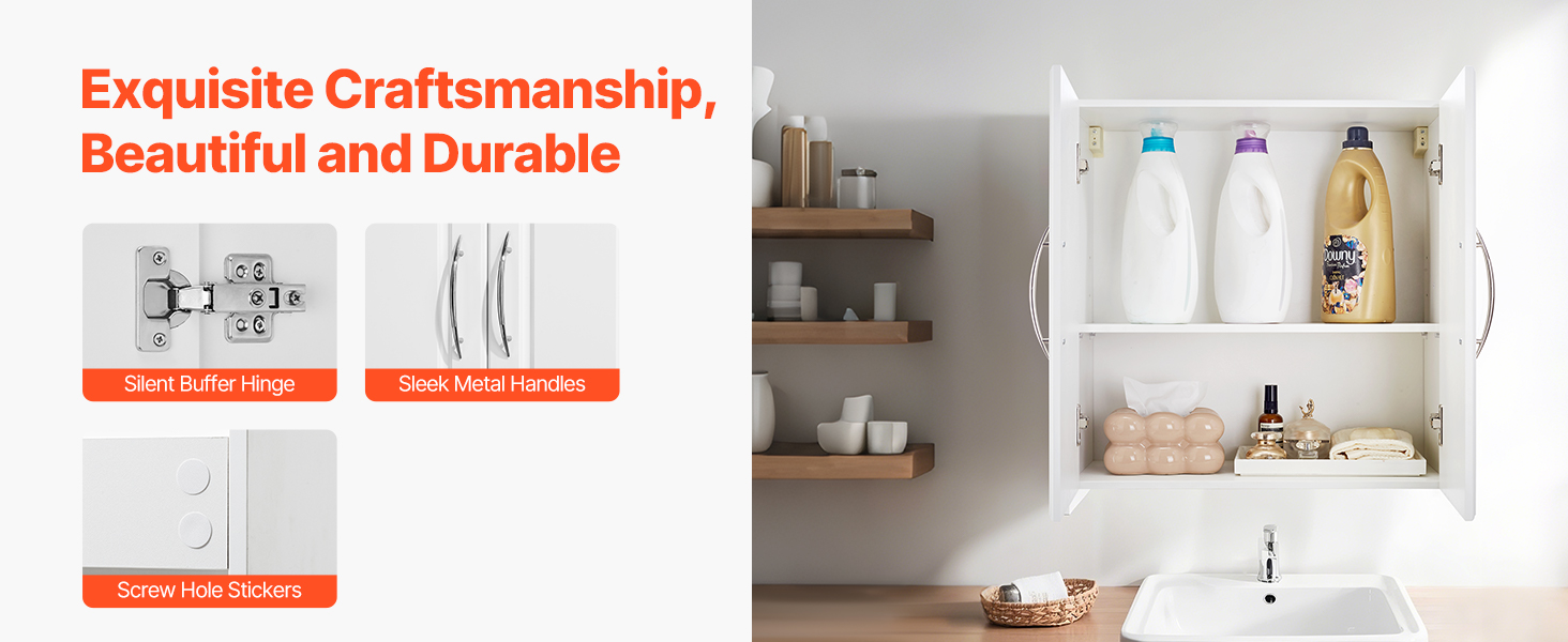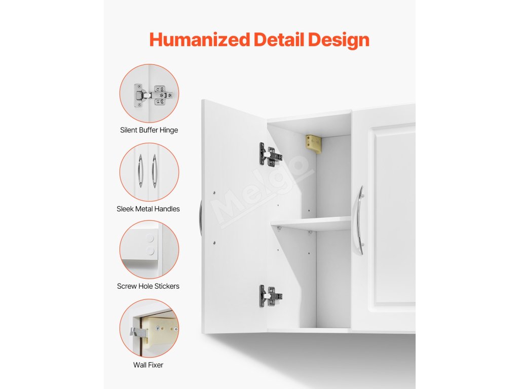 Naša nástenná skrinka má kovové úchyty na jednoduché otváranie a zatváranie. Tiché závesy s mäkkým zatváraním umožňujú pomalé zatváranie dvierok, čím sa predíde skrehnutiu prstov. Kryty otvorov na skrutky zabraňujú vnikaniu prachu.