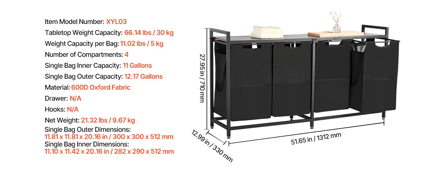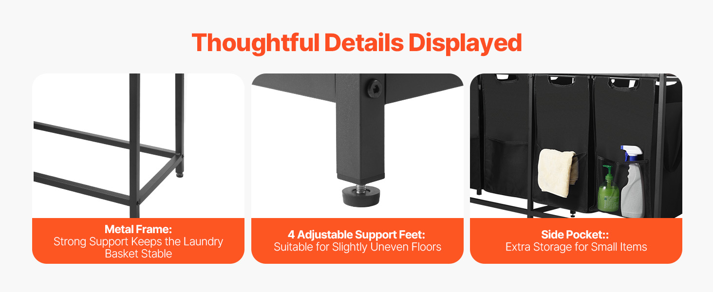 Zostavený so zosilneným kovovým rámom pre dlhodobú stabilitu a odolnosť. Štyri nastaviteľné nožičky udržia kôš stabilný na nerovných podlahách. Obsahuje bočné vrecko na usporiadanie drobných predmetov, ako sú ponožky, vrecká na bielizeň - udržiava váš priestor na pranie čistý a efektívny.