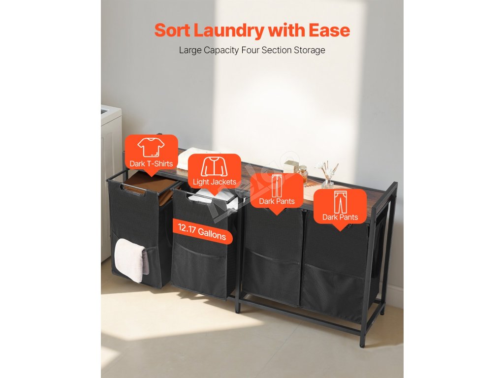 Dve priehradky s objemom 46,68 litra, vyrobené z odolnej, nepremokavej a ohybom odolnej tkaniny - ideálne na triedenie svetlého/čierneho, mokrého/suchého alebo oblečenia pre dospelých/deti, aby bola vaša domácnosť čistá a usporiadaná.