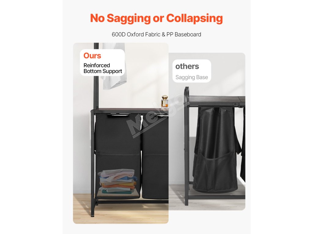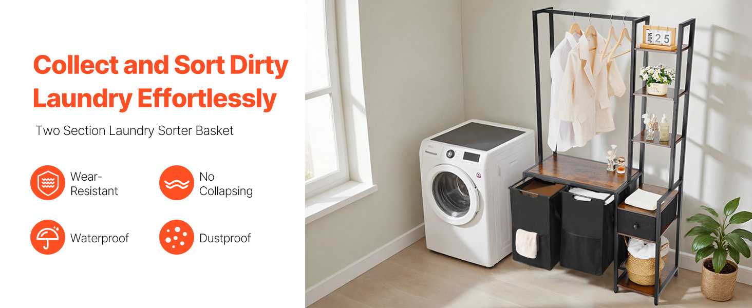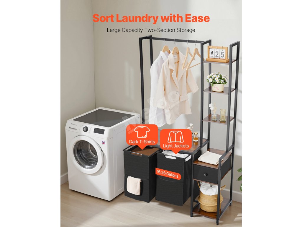 Dve priehradky s objemom 32,52 litra, vyrobené z odolnej, nepremokavej a proti prehýbaniu odolnej tkaniny - ideálne na triedenie svetlého/čierneho, mokrého/suchého alebo oblečenia pre dospelých/deti, aby bola vaša domácnosť čistá a usporiadaná.