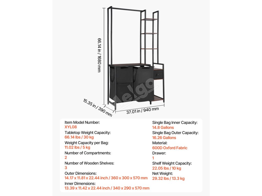 Stojan na triedenie prádla s regálom, 3 úrovne, 2 sekcie, vaky 600D