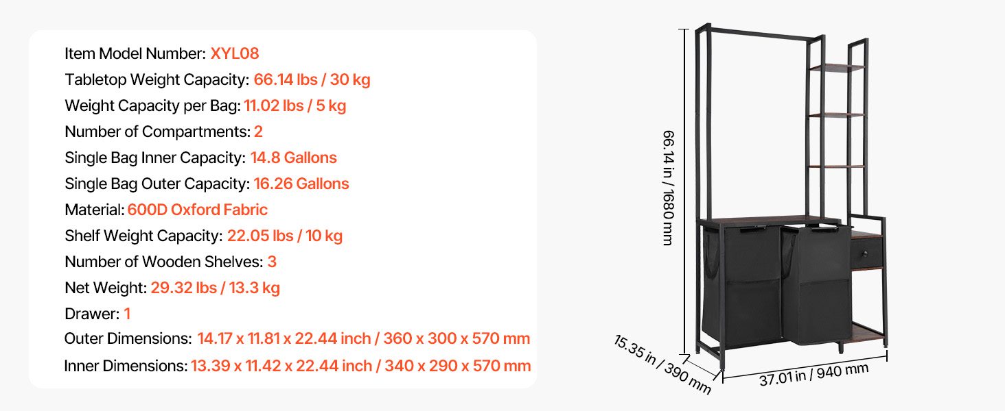 | Rozmery výrobku | 37.01 x 15,35 x 66,14 in / 940 x 390 x 1680 mm |