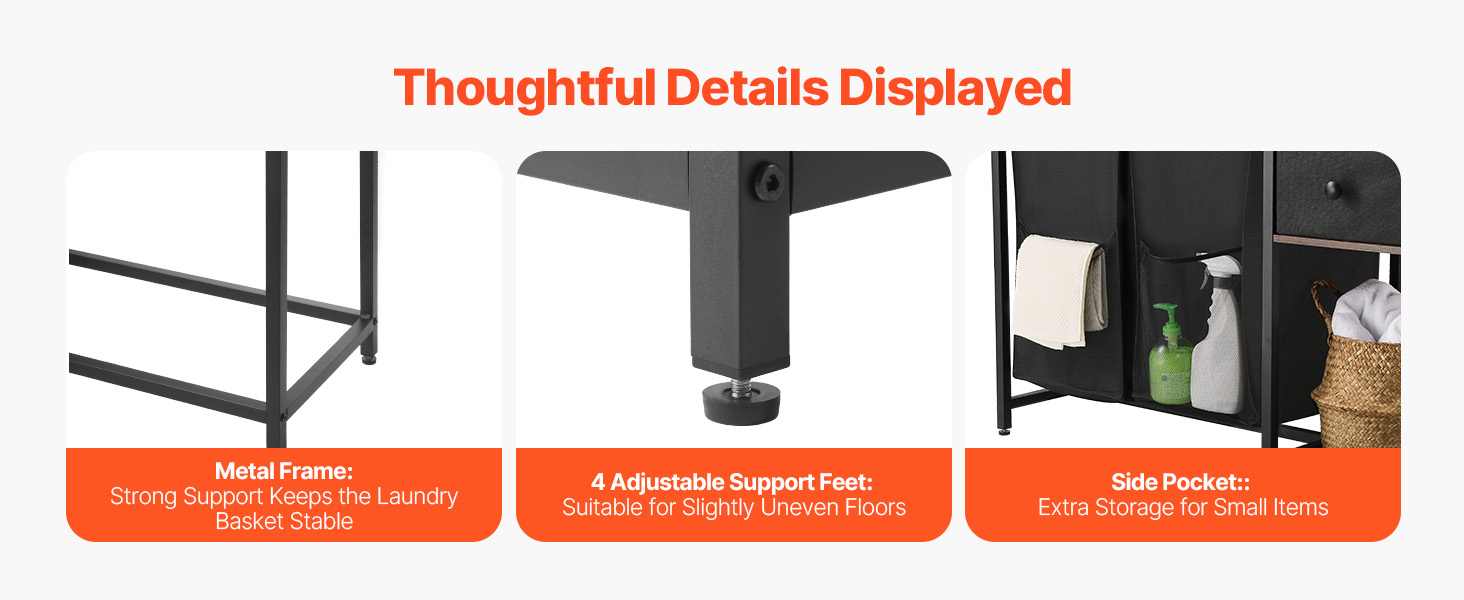 Zostavený so zosilneným kovovým rámom pre dlhotrvajúcu stabilitu a odolnosť. Štyri nastaviteľné nožičky udržujú kôš stabilný na nerovných podlahách. Obsahuje bočné vrecko na usporiadanie drobných predmetov, ako sú ponožky, vrecká na bielizeň - udržiava váš priestor na pranie čistý a efektívny.