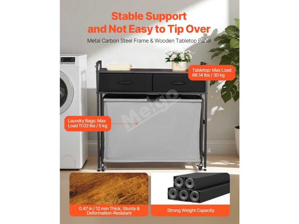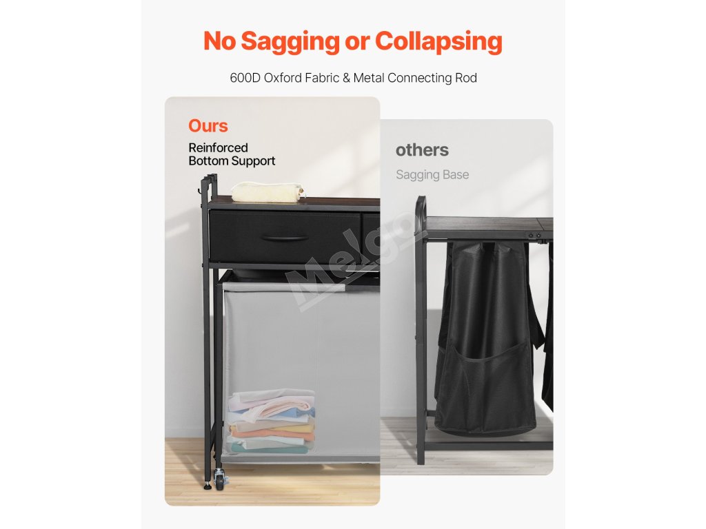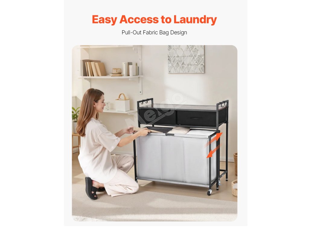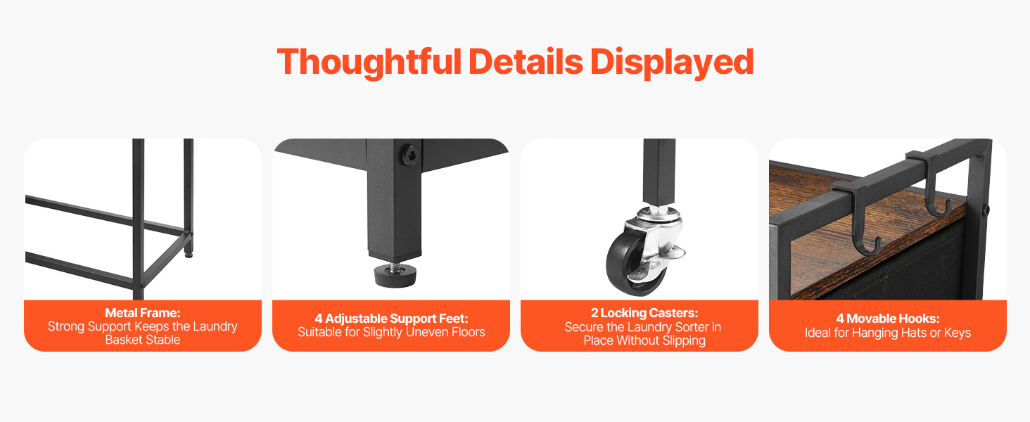 Náš triedič bielizne má zosilnený kovový rám, ktorý poskytuje stabilnú oporu. Nastaviteľné nožičky vyhovujú rôznym typom podláh, zatiaľ čo dvojité blokovacie kolieska udržia kôš bezpečne na mieste. Dodáva sa s odnímateľným háčikom na jednoduché uloženie kľúčov, klobúkov.