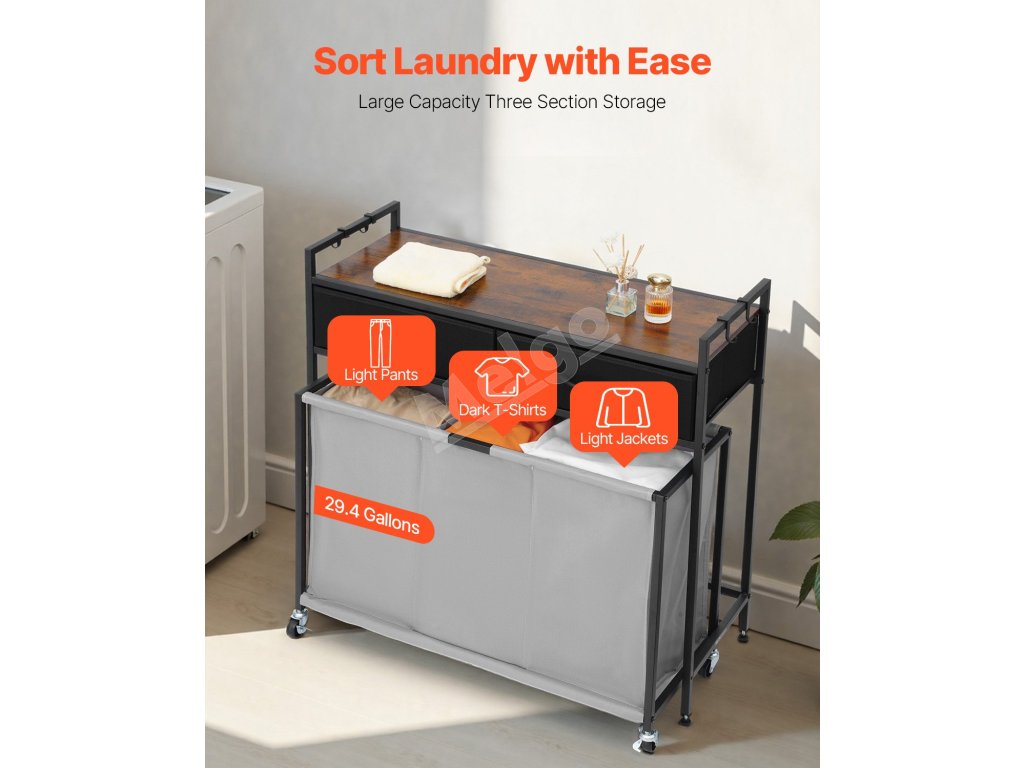 Dve priehradky s objemom 29,4 litra, vyrobené z odolnej, nepremokavej a proti prehýbaniu odolnej tkaniny - ideálne na triedenie svetlého/čierneho, mokrého/suchého alebo oblečenia pre dospelých/deti, aby ste mali doma čisto a usporiadane.