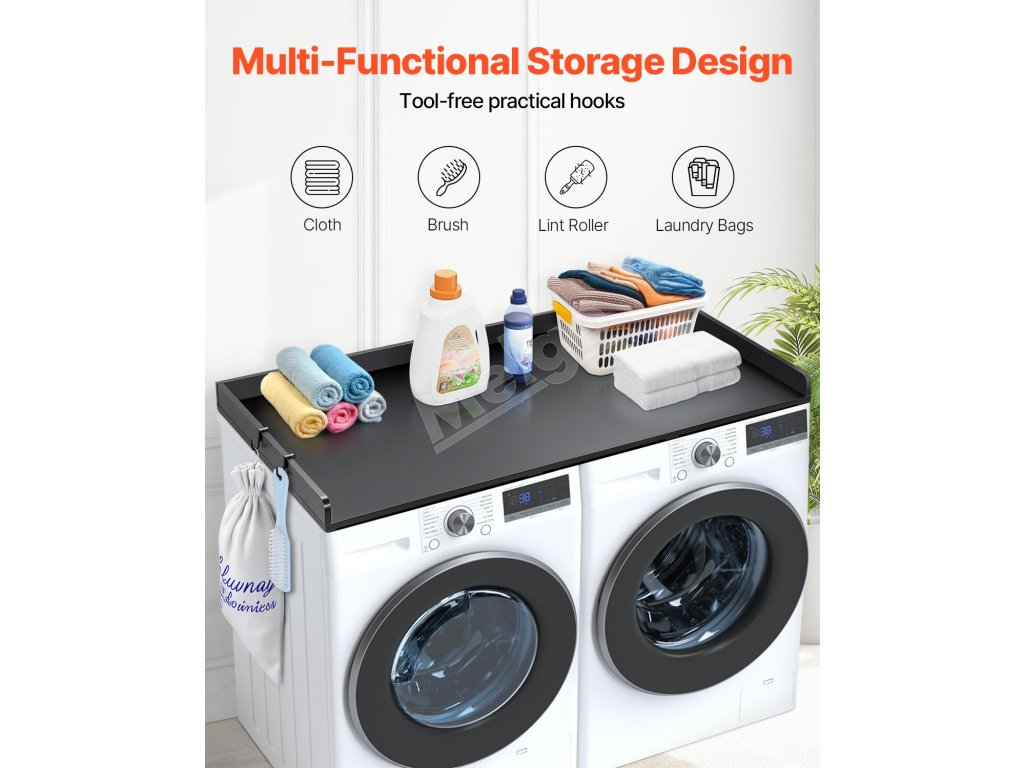 Táto pracovná doska na práčku a sušičku je 54 palcov široká a 27 palcov hlboká, čím poskytuje priestrannú pracovnú plochu pre vašu práčovňu. Či už skladáte oblečenie, triedite veci alebo ukladáte pracie potreby, táto veľká plocha splní všetky vaše potreby.