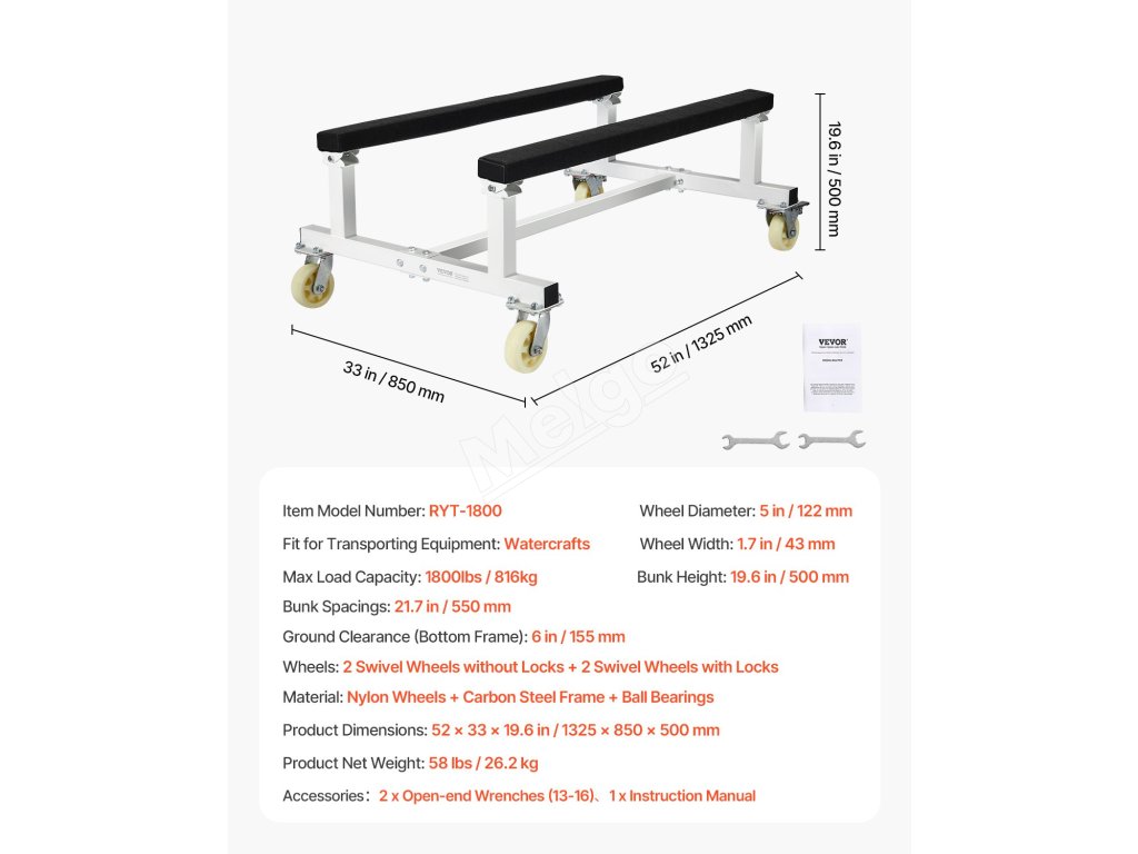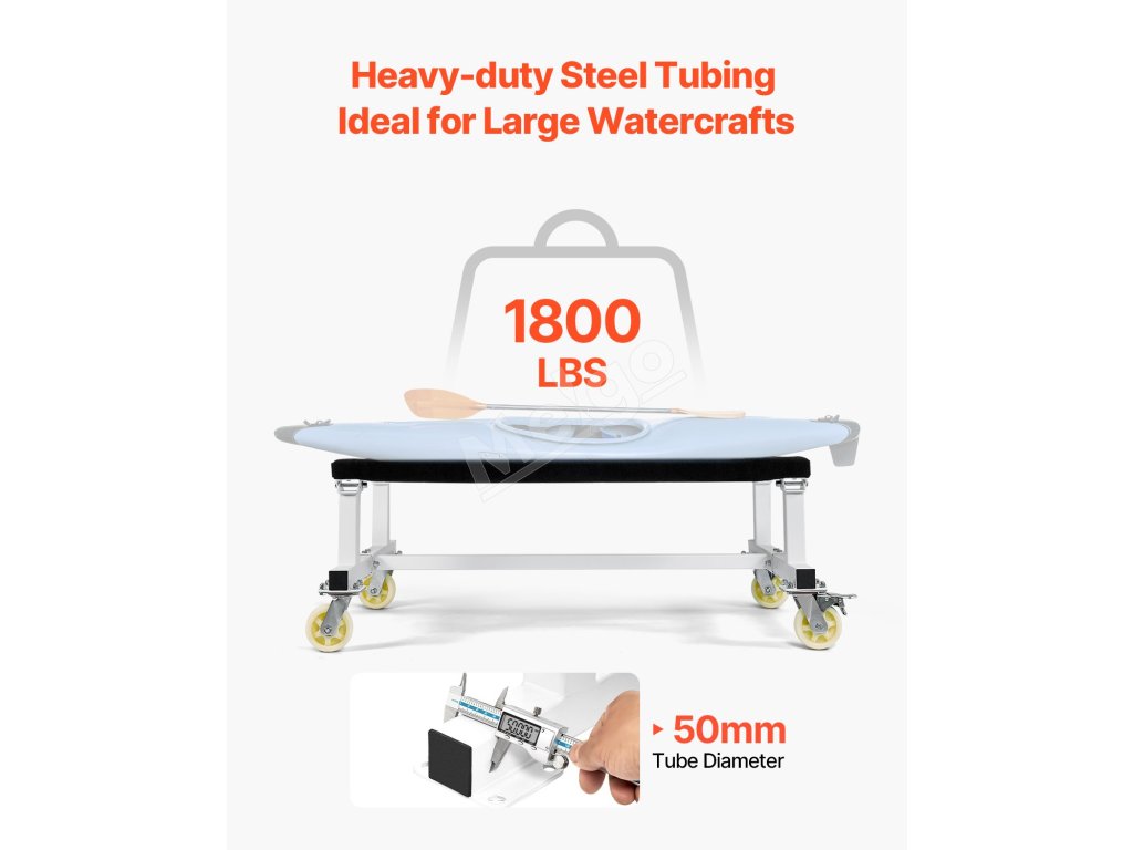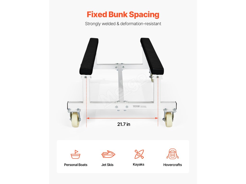 Zvárané lôžko a nosné rúrky s pevným rozstupom 22 palcov zabezpečujú vysokú stabilitu a nosnosť, čím zabraňujú kolísaniu počas skladovania alebo prepravy. Vozík na vodné skútre je ideálny na prepravu stredne veľkých až veľkých lodí a je tiež ideálny na vystavenie v predajniach vodných skútrov.
