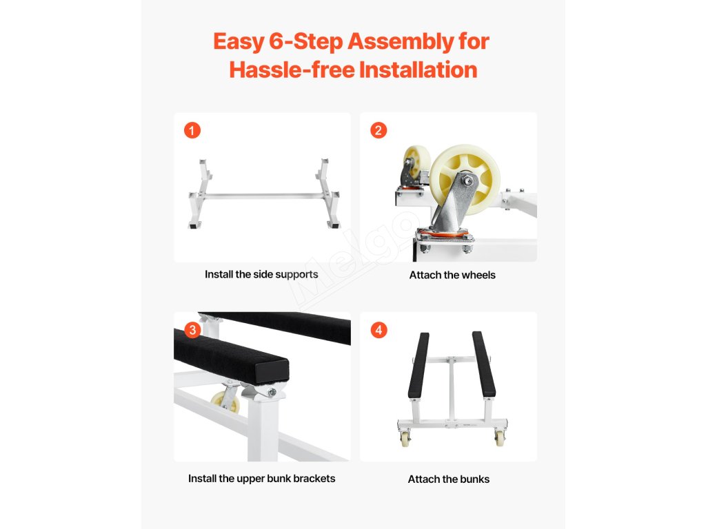 Stojan na vodné skútre na kolieskach sa dodáva so všetkými dielmi potrebnými na montáž a podrobným návodom, takže nebudete musieť kupovať ďalšie diely ani náradie. Jedna osoba ho ľahko zostaví, a keď sa nepoužíva, možno ho rozložiť a uskladniť, čím sa ušetrí miesto a je ľahšie prenosný.