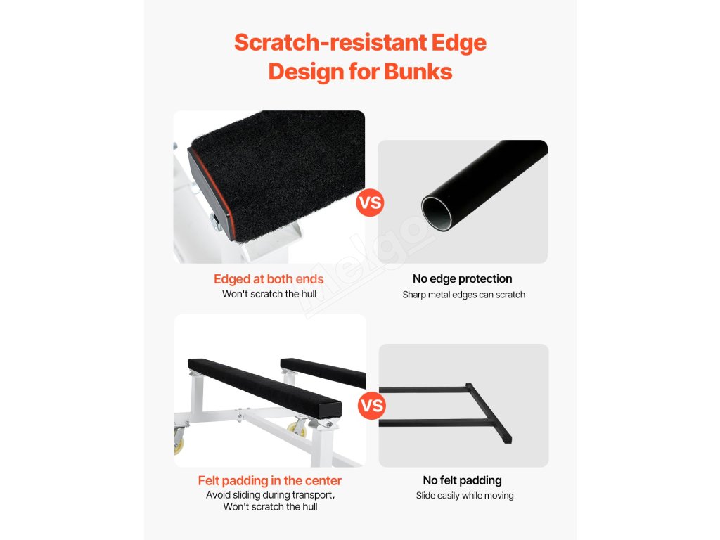 Mäkká plsť úplne pokrýva lôžkové rúry vrátane oboch koncov, čím zlepšuje vzhľad stojanu na vodné skútre pwc vozíka a zároveň účinne zabraňuje poškriabaniu lode počas presunov. Filc tiež zvyšuje trenie, čím zabraňuje posúvaniu člna počas presunu a zvyšuje bezpečnosť.