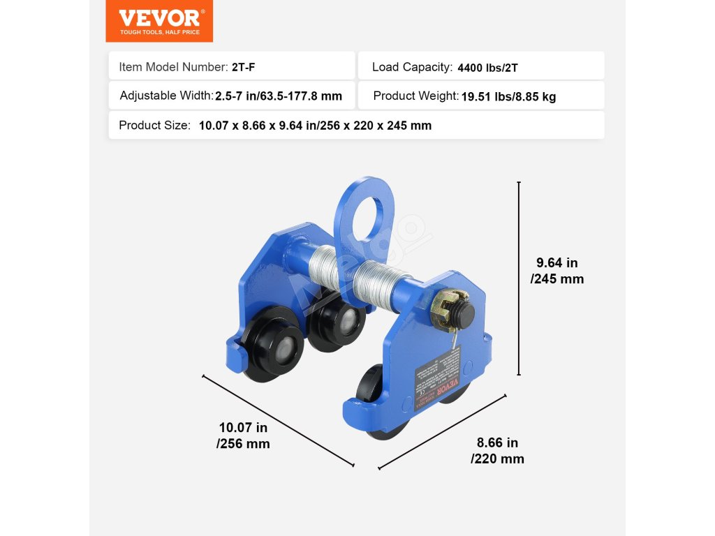 Manuálny vozík po i-nosníku 4400 lbs/2 ton, nastaviteľný 63.5-177.8 mm