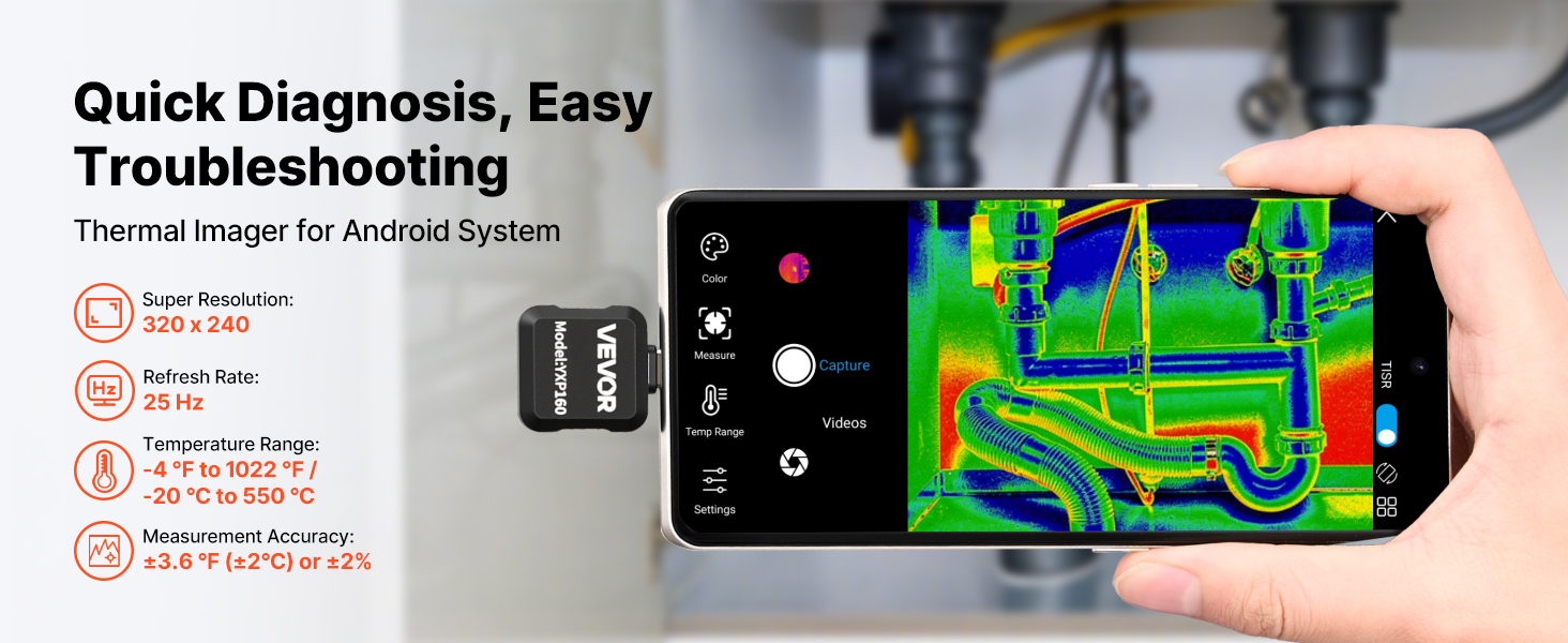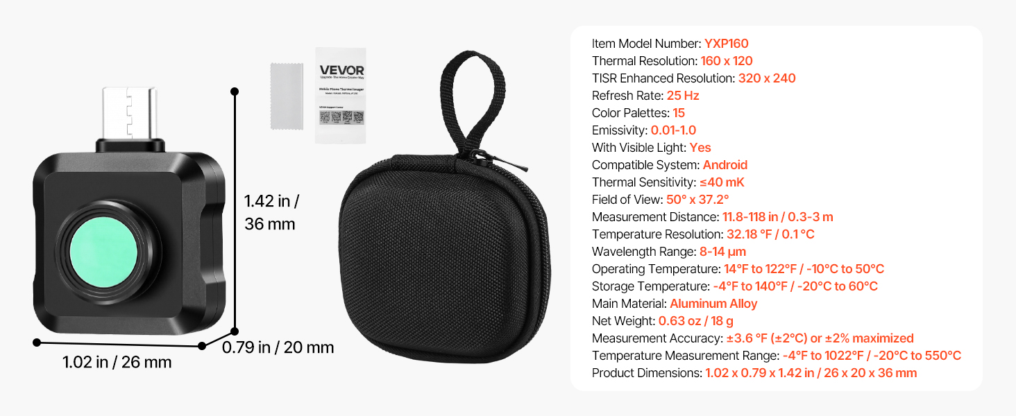 S rozlíšením 320 x 240, infračerveným rozlíšením 160 x 120, obnovovacou frekvenciou 25 Hz a rozsahom merania teploty od -4 do 1022 °F je termovízna kamera VEVOR pre Android ideálnou voľbou pre inšpekciu domov, klimatizáciu, elektrickú diagnostiku a ďalšie použitia.