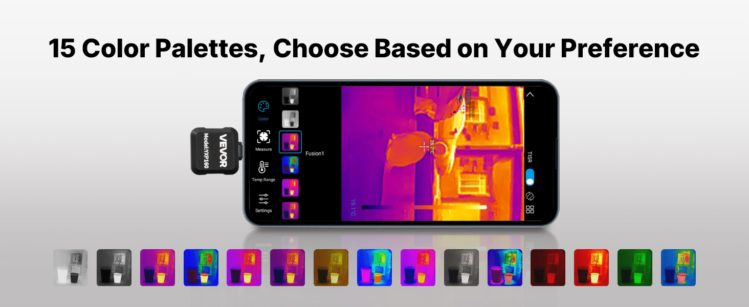 Vyberte si z 15 farebných paliet na zobrazenie termálnych snímok podľa vašich preferencií, čím sa teplotné rozdiely stanú jasnejšími a pomôžu vám ľahšie identifikovať horúce a studené miesta.