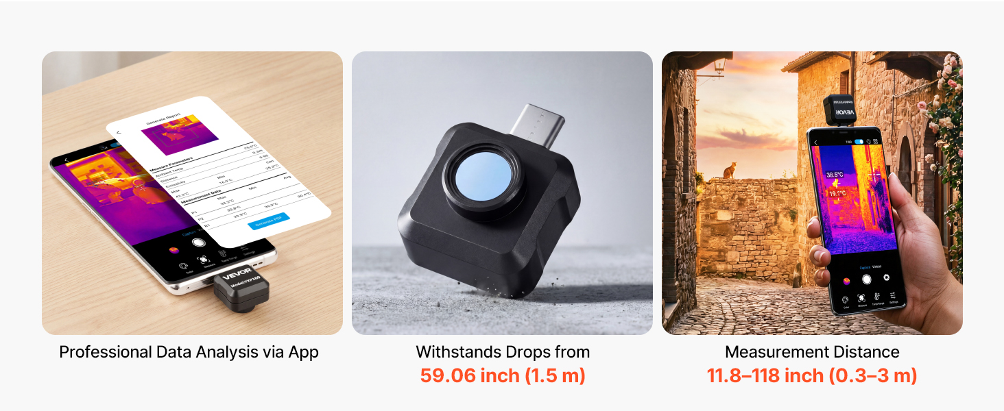 Použite aplikáciu na meranie teploty a analýzu obrazu a ľahko exportujte profesionálne správy. Odolná voči pádom z výšky až 59 palcov (1,5 m), s efektívnou meracou vzdialenosťou 11,8–118,1 palca (0,3–3 m).