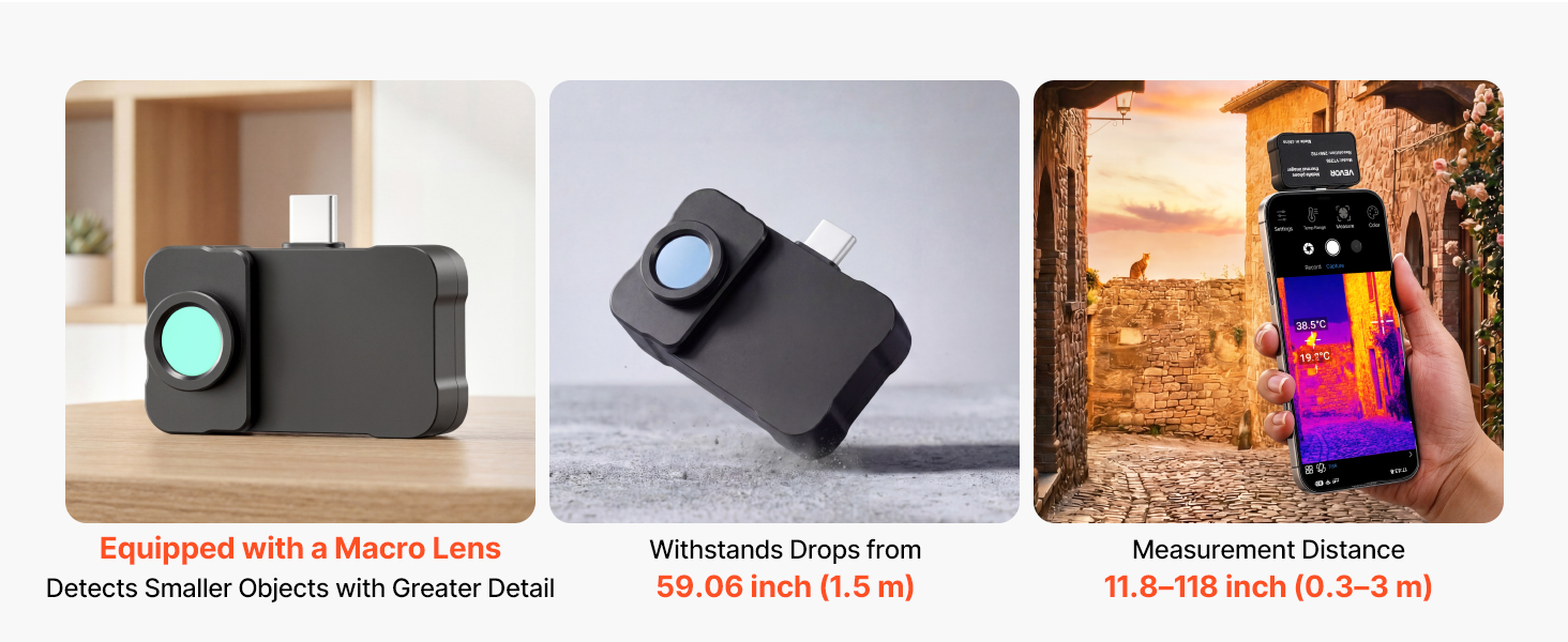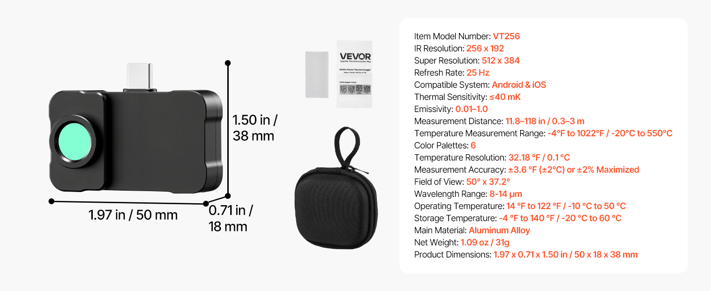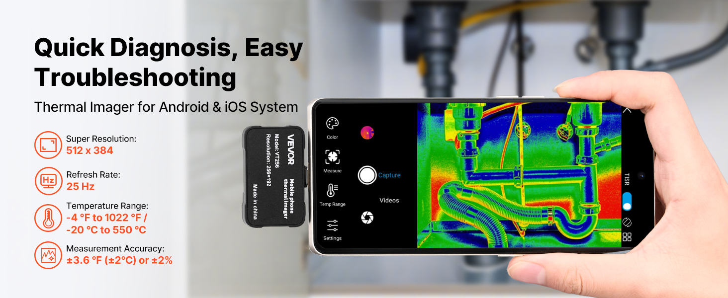 S rozlíšením 512 x 384, infračerveným rozlíšením 256 x 192, priloženým makroobjektívom, obnovovacou frekvenciou 25 Hz a meraním teploty v rozmedzí -4 až 1022 °F je termovízna kamera VEVOR pre Android a iOS ideálnou voľbou pre domáce inšpekcie, klimatizáciu, elektrickú diagnostiku a ďalšie použitie.