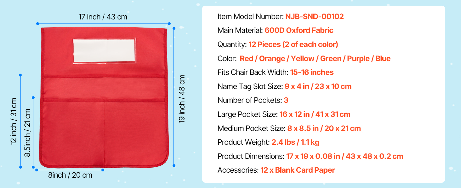 Vrecká na operadlo stoličky 12 ks, 17×19 inches, 6 farieb, s menovkami
