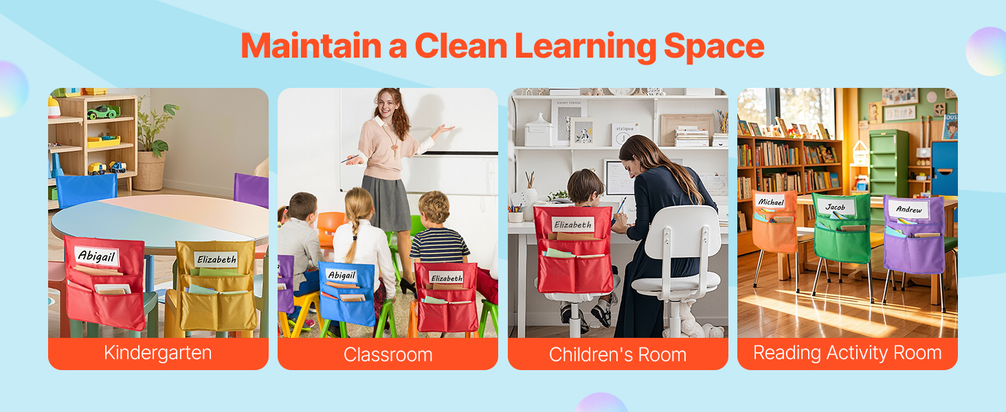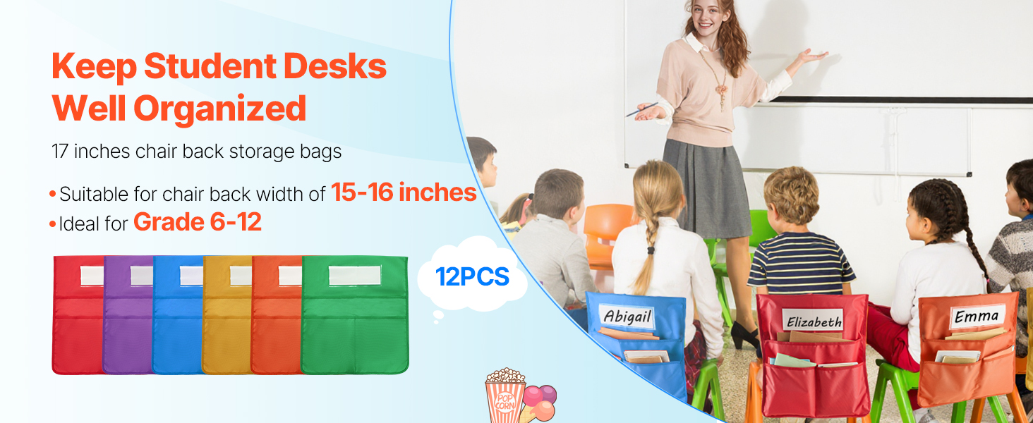 Udržujte poriadok na písacích stoloch s našimi vreckami na opierky stoličiek! Táto 12-dielna súprava je vhodná do tried a je skvelým darčekom. Hodí sa na stoličky s priemerom 15-16 palcov, ideálne pre žiakov 6. až 12. ročníka, aby si udržali poriadok.