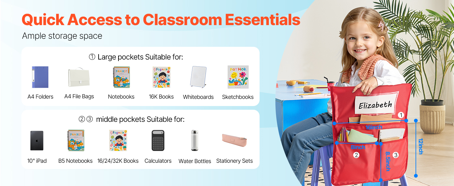 Naša tabuľka vreciek na operadlo stoličky obsahuje 1 veľké vrecko a 2 stredné vrecká na uloženie zakladačov, zošitov a kníh formátu A4. Umožňuje ľahké uchopenie pomôcok a zároveň učí deti hodnote organizácie!