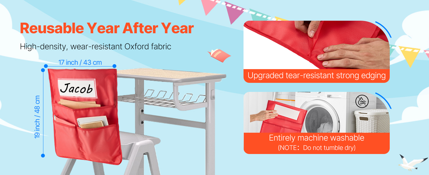 Vreckár pre študentov na stoličku je vyrobený z tkaniny Oxford s vysokou hustotou 600D a vylepšenými okrajmi pre trvalú odolnosť. Možno ho prať v práčke - používajte ho opakovane bez opotrebovania.