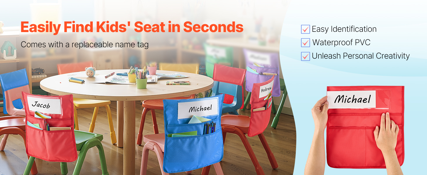 Naše vrecko na školskú stoličku obsahuje priehľadný otvor na meno z PVC na jednoduché prispôsobenie. Nechajte deti navrhnúť si vlastné menovky a urobte triedu zábavnejšou a personalizovanejšou!