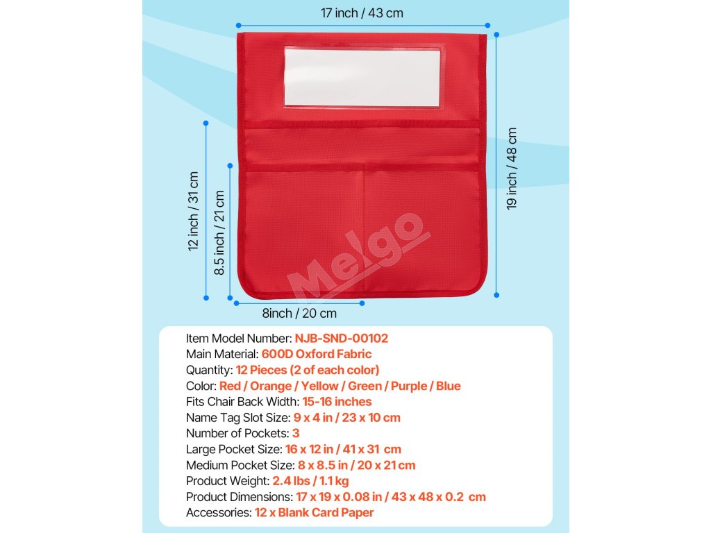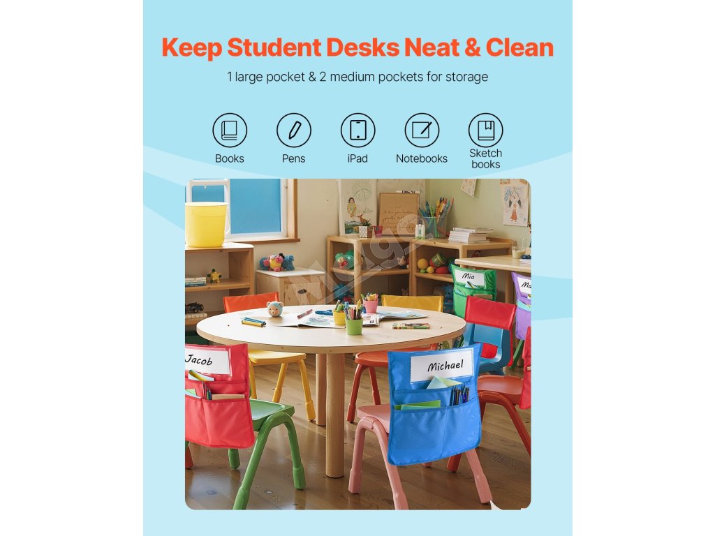 Udržujte poriadok na písacích stoloch s našimi vreckami na opierky stoličiek! Táto 12-dielna súprava je vhodná do tried a je skvelým darčekom. Hodí sa na stoličky s priemerom 15-16 palcov, ideálne pre žiakov 6. až 12. ročníka, aby si udržali poriadok.