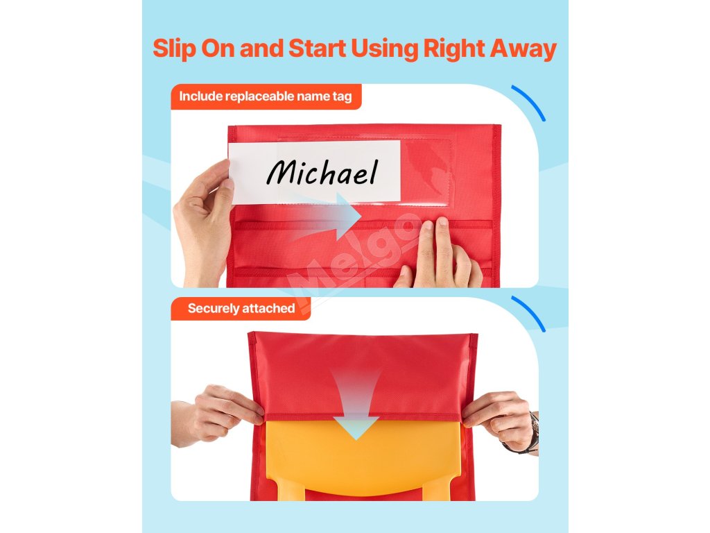 Naše vrecko na školskú stoličku obsahuje priehľadný otvor na meno z PVC na jednoduché prispôsobenie. Nechajte deti navrhnúť si vlastné menovky a urobte triedu zábavnejšou a personalizovanejšou!