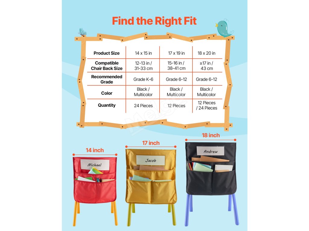 Naša tabuľka vreciek na operadlo stoličky obsahuje 1 veľké vrecko a 2 stredné vrecká na uloženie zakladačov, zošitov a kníh formátu A4. Umožňuje ľahké uchopenie pomôcok a zároveň učí deti hodnote organizácie!