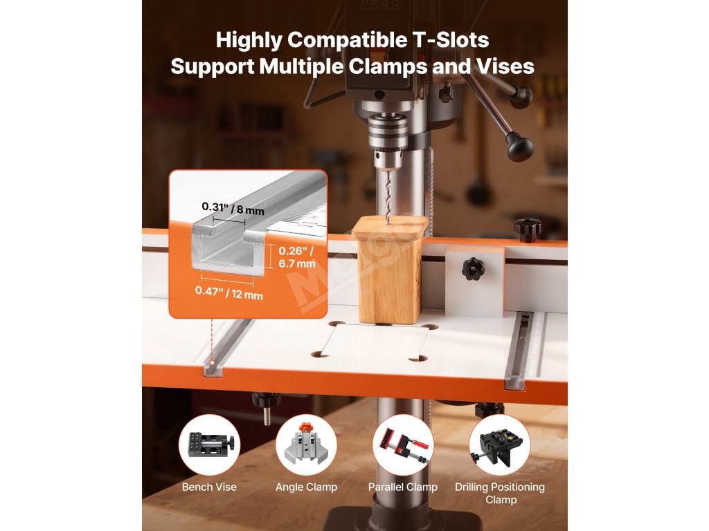 Tento stôl pre vŕtačku je kompatibilný so zverákmi, uhlovými svorkami, paralelnými svorkami a svorkami na vŕtanie, čo uľahčuje vŕtanie, frézovanie, brúsenie alebo opakované úlohy.
