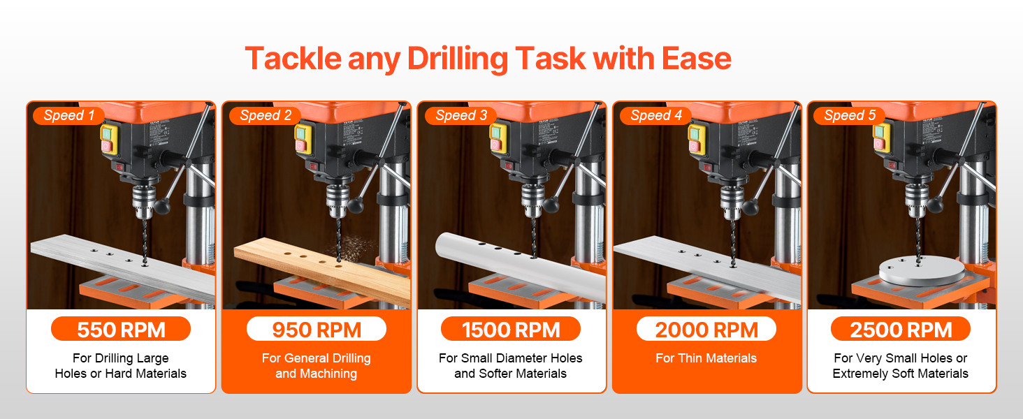 Prepínajte medzi 5 nastaveniami rýchlosti nastavením polohy pásu, čím prispôsobíte rýchlosť stolového vŕtacieho lisu rôznym materiálom a veľkostiam obrobkov pre optimálnu účinnosť a presnosť.