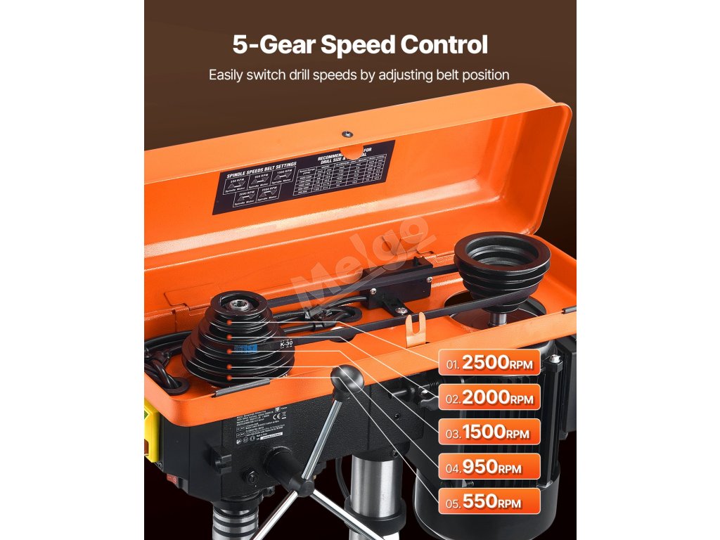 Prepínajte medzi 5 nastaveniami rýchlosti nastavením polohy pásu, čím prispôsobíte rýchlosť stolového vŕtacieho lisu rôznym materiálom a veľkostiam obrobkov pre optimálnu účinnosť a presnosť.