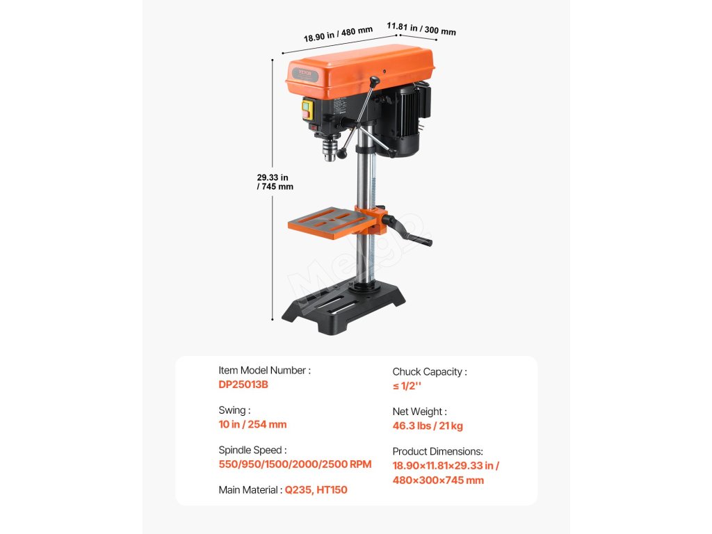 Stolová vŕtačka 254 mm 550 W 550-2500 RPM stôl 0-45° na drevo a kov