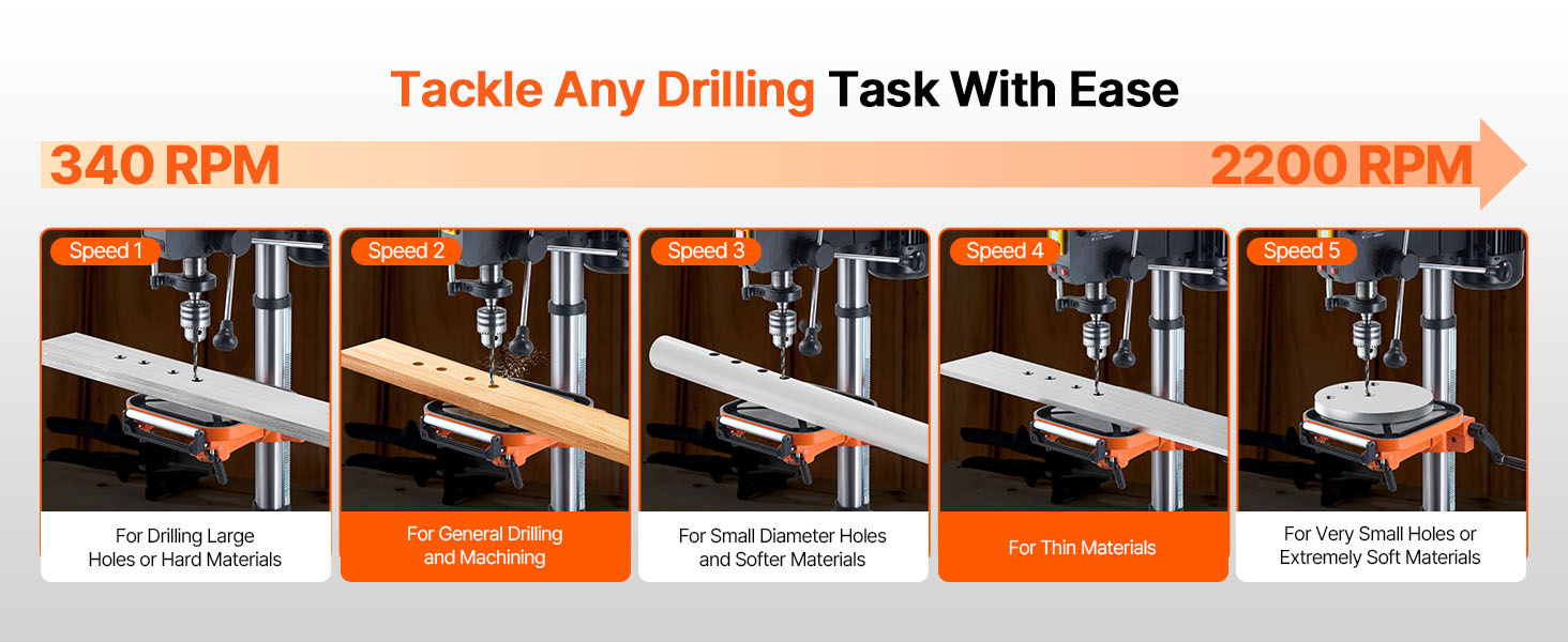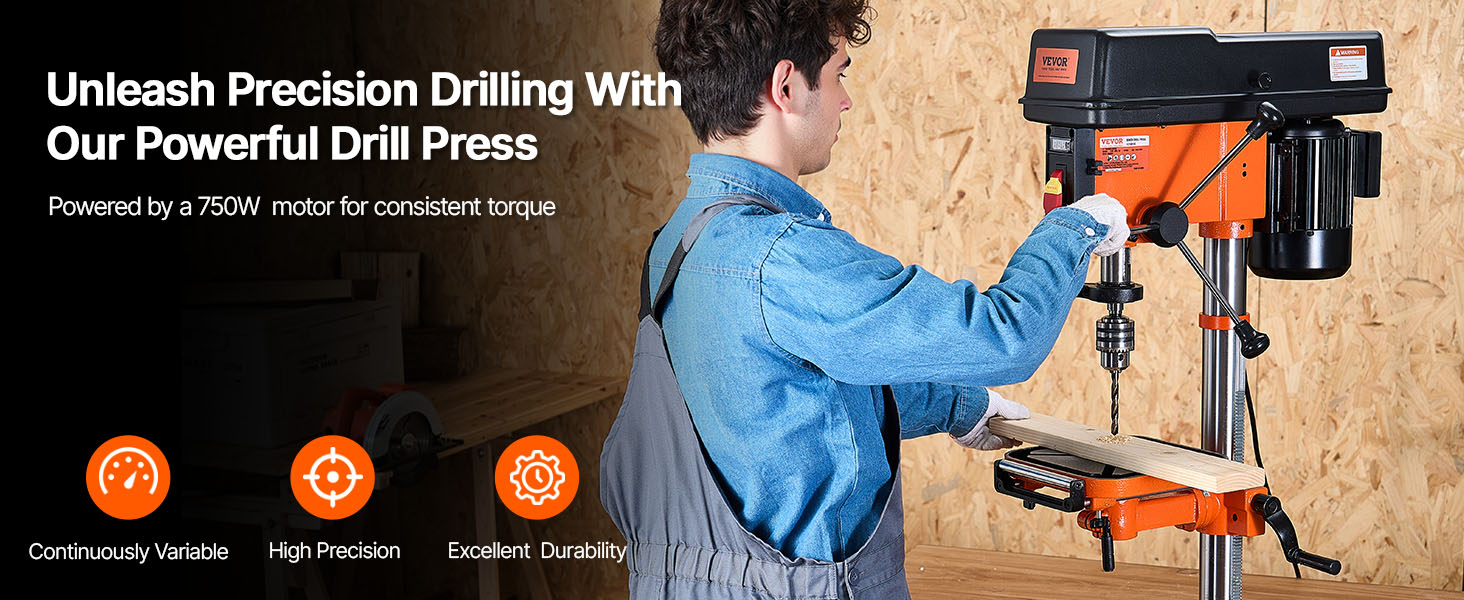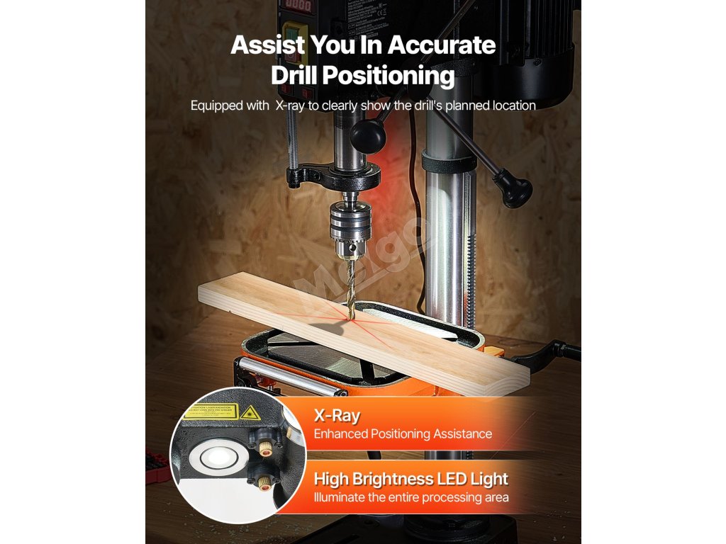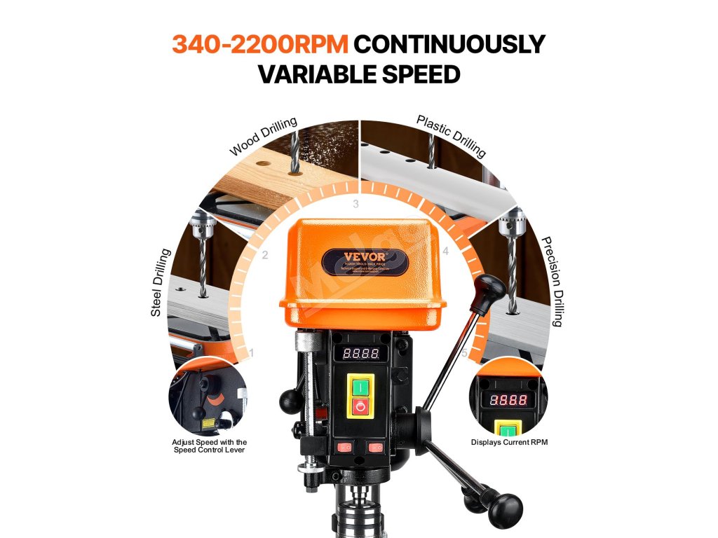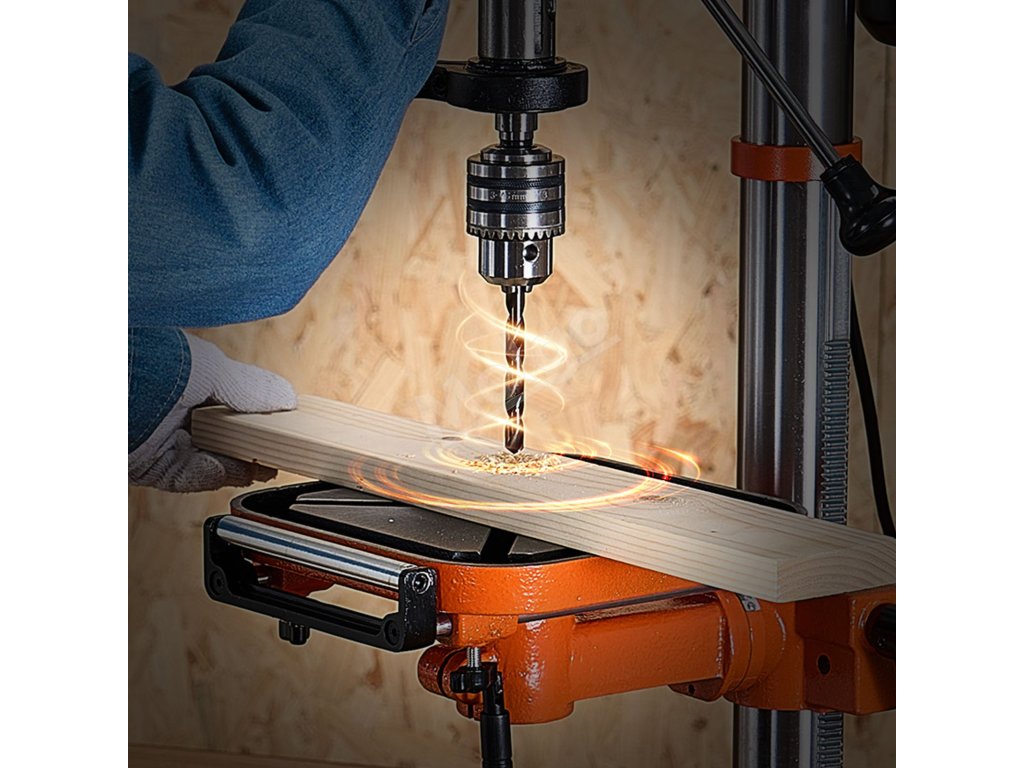 Náš stolný vŕtací lis s celočiernym indukčným motorom a variabilným nastavením otáčok 340-2200 ot/min zvládne vaše práce s drevom, kovom alebo iné vŕtacie úlohy. Vďaka röntgenovému polohovaniu pre presné vŕtanie, LED osvetleniu a pracovnému stolu s nastaviteľným sklonom 45° pre komplexné potreby vŕtania.
