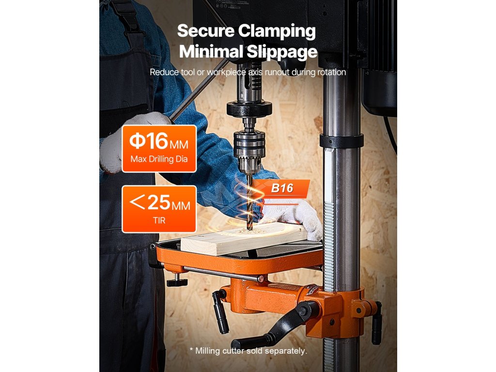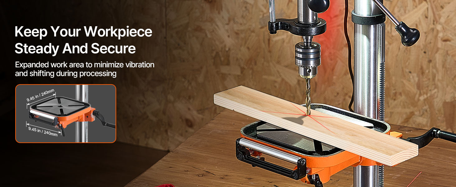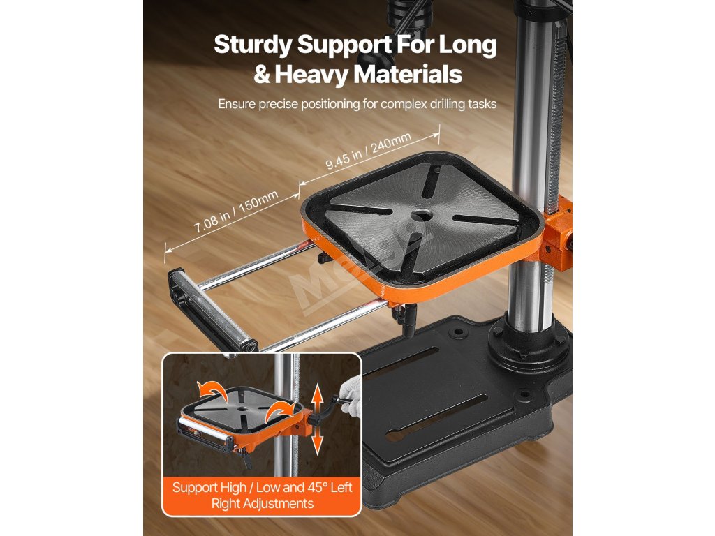 Pracovný stôl vyrobený zo zosilneného kovu pre vynikajúcu stabilitu podporuje nastavenie výšky a uhla 45°, čo umožňuje presné polohovanie a zvládnutie komplexných vŕtacích úloh.