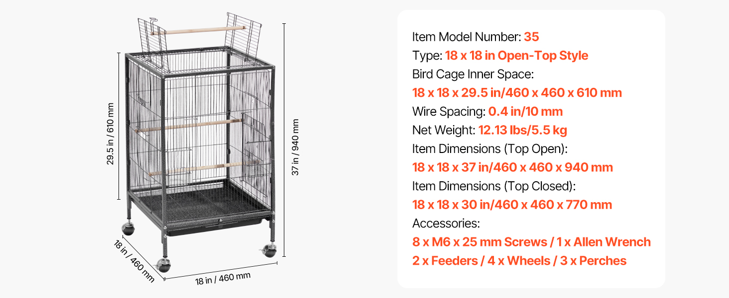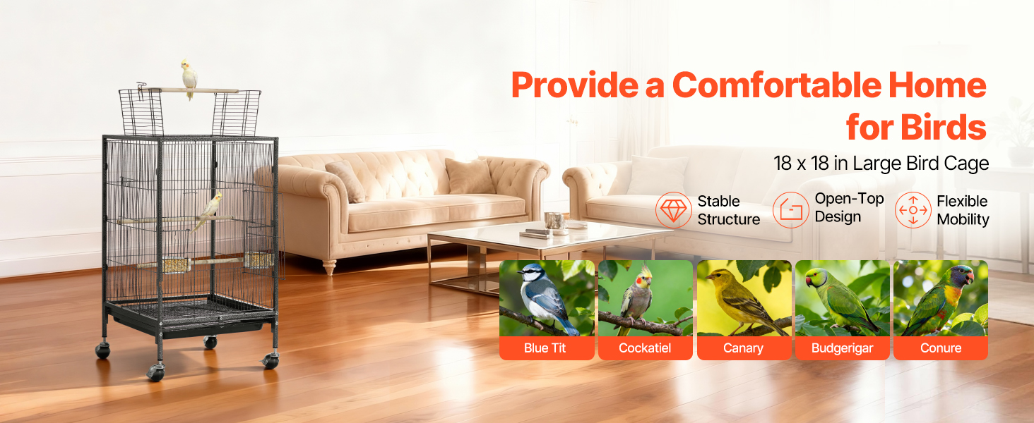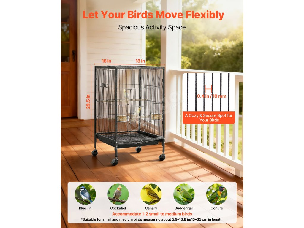 Táto klietka pre vtáky s rozmermi 18 x 18 palcov a rozstupom tyčí 0,4 palca poskytuje dostatok priestoru na aktivity pre konury, hrdličky, vtáčiky, kanáriky a ďalšie vtáky.