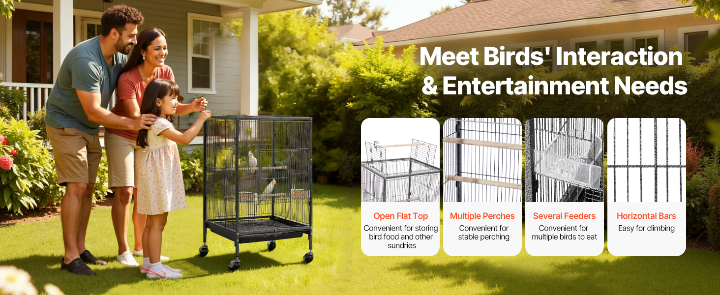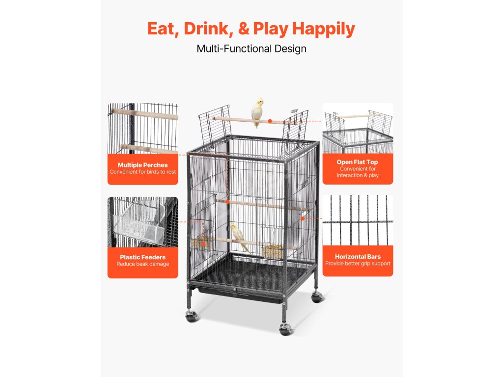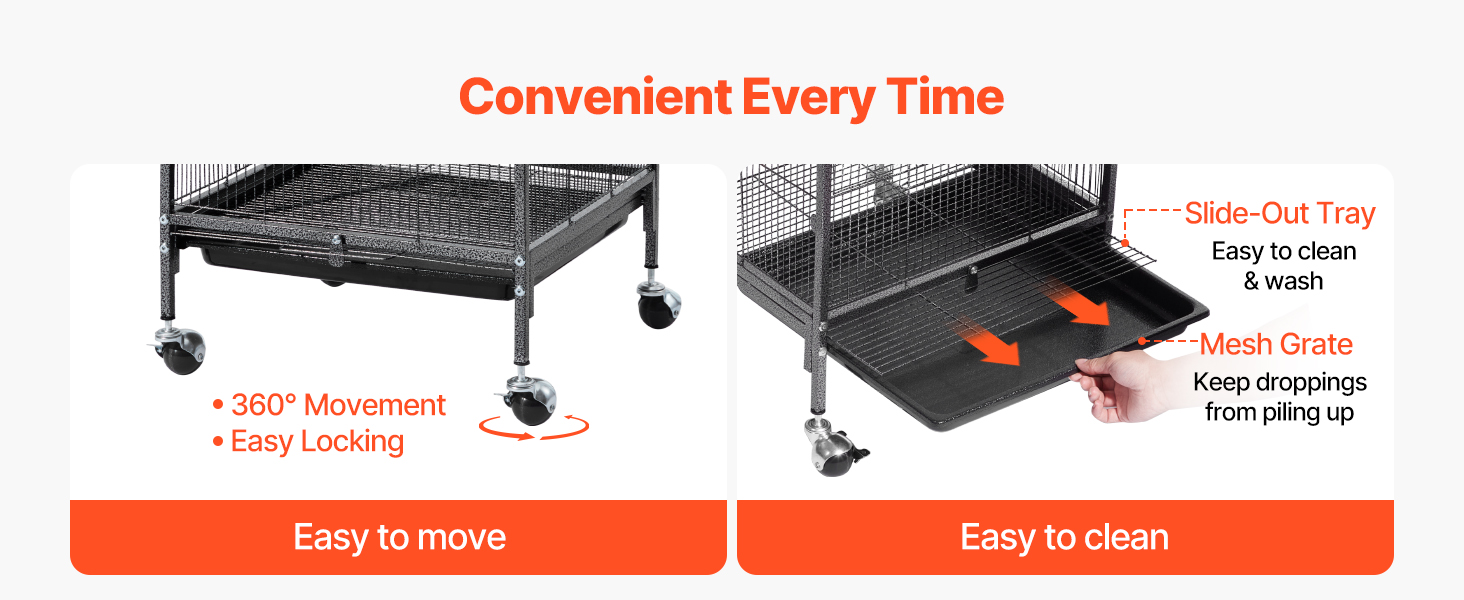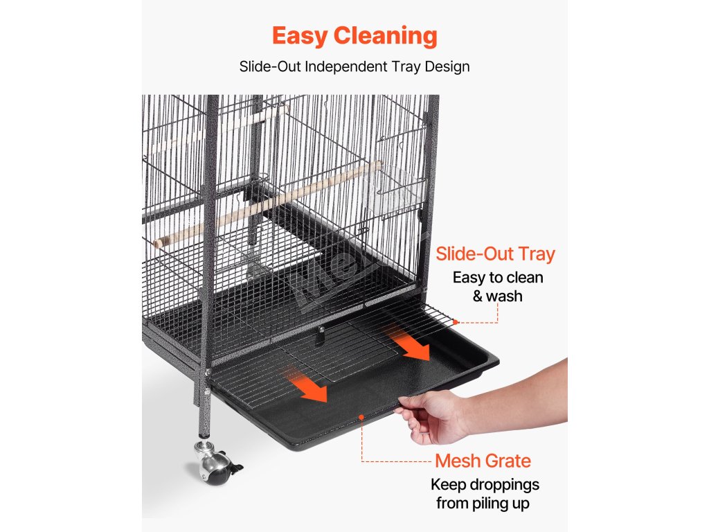 Naša klietka pre papagáje je vybavená 4 robustnými pojazdnými kolieskami, vďaka ktorým sa hladko kotúľa a dá sa ľahko kamkoľvek premiestniť. Posuvný zásobník sa dá ľahko vytiahnuť a vyčistiť a sieťový rošt oddeľuje domáce zvieratá a odpad, aby sa nehromadil trus, čím sa udržiava čistý a svieži stav.
