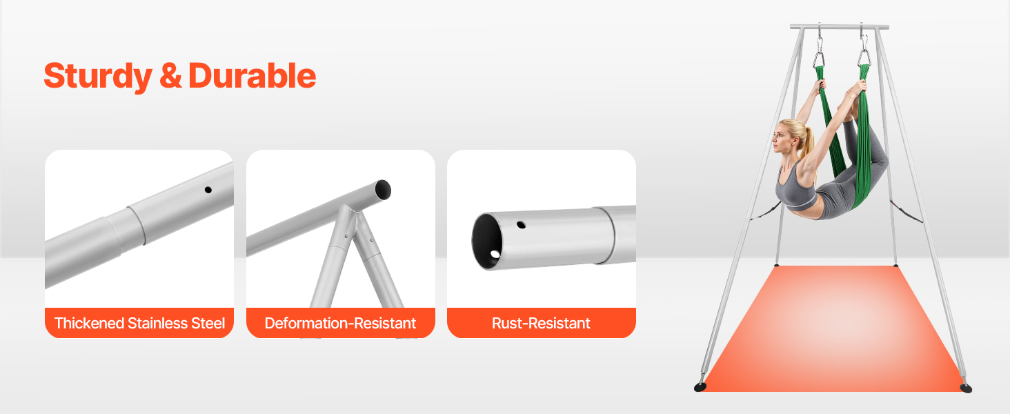 Skúste to s týmto chrómovaným stojanom na vzdušnú jogu. Viacnásobné testy soľnou hmlou zaručujú odolnosť proti korózii, zatiaľ čo odolný povrch vydrží každodenné opotrebovanie. Vďaka minimálnej údržbe sa rám leskne a zachováva vzhľad a funkčnosť vášho zariadenia na jogu, nech ho používate kdekoľvek.
