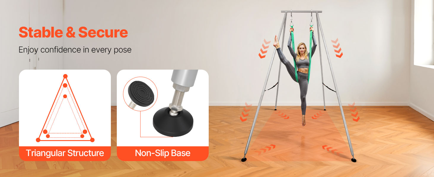 Pozdvihnite svoje inverzie s týmto vzdušným hodvábnym stojanom postaveným na trojuholníkovej konštrukcii. Jeho konštrukcia rovnomerne rozkladá hmotnosť a protišmyková základňa zvyšuje stabilitu. Stojan je ideálny pre všetky úrovne zručností, poskytuje vyváženú platformu na cvičenie pozícií a umožňuje vám naplno si vychutnať cestu jogou.