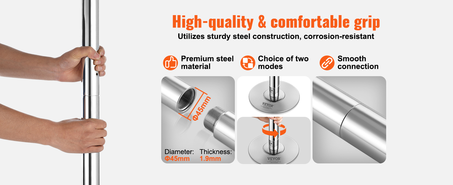 Táto prenosná tanečná tyč je vyrobená so štandardnou 45 mm oceľovou tyčou, ktorá zvyšuje pohodlie s práškovou povrchovou úpravou, odolnou proti korózii a hrdzi, čím poskytuje spoľahlivú záruku bezpečnosti a trvanlivosti. Maximálna nosnosť: 200 kg/441 libier.