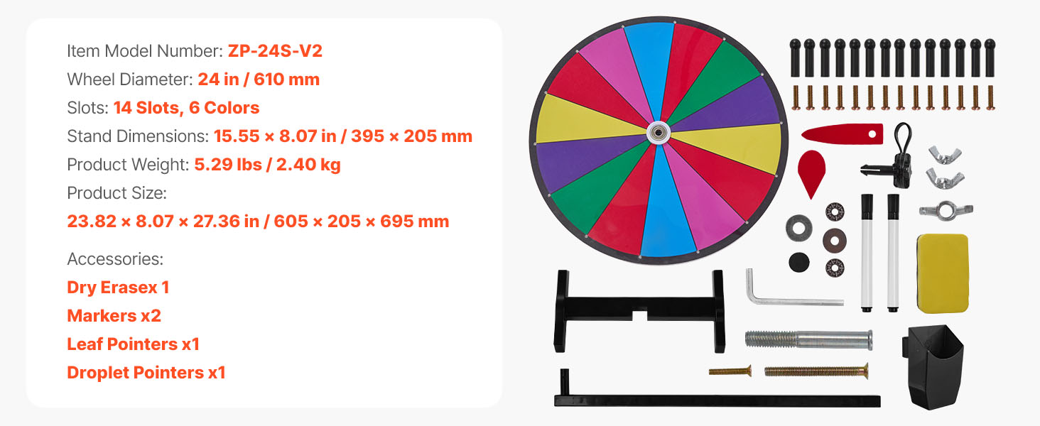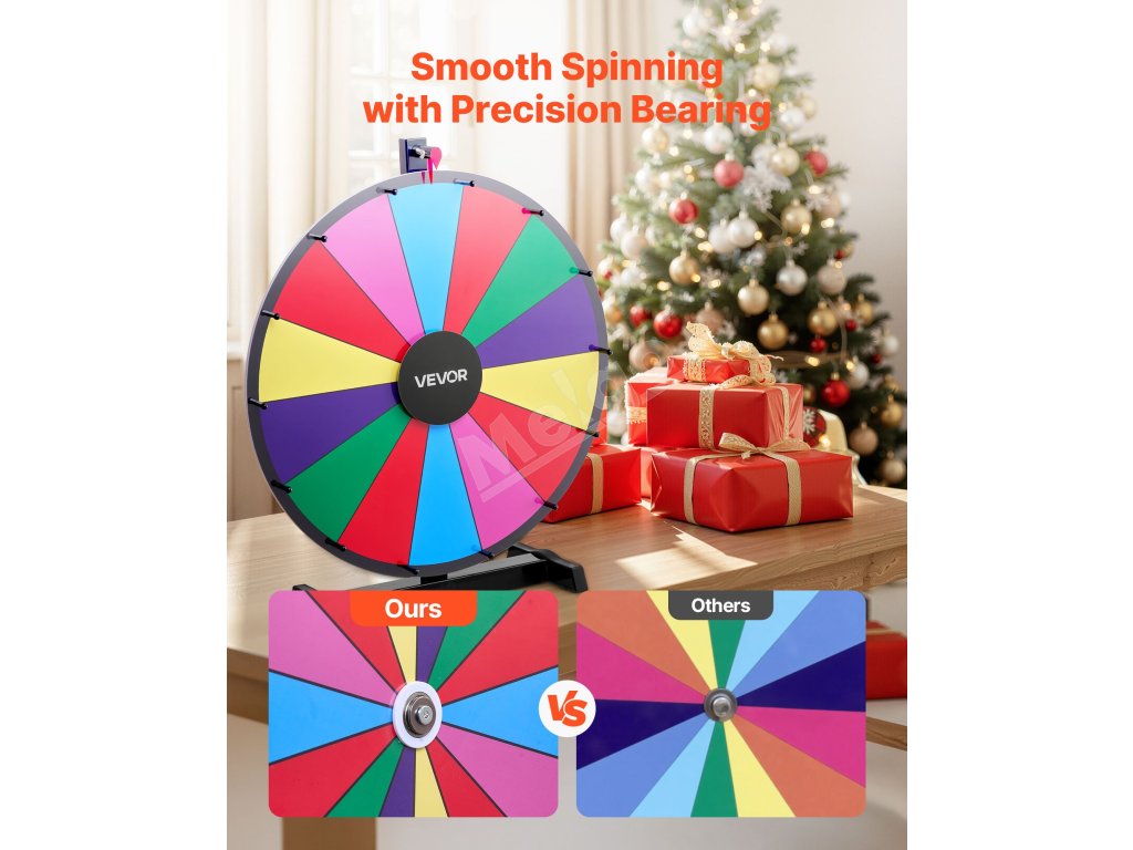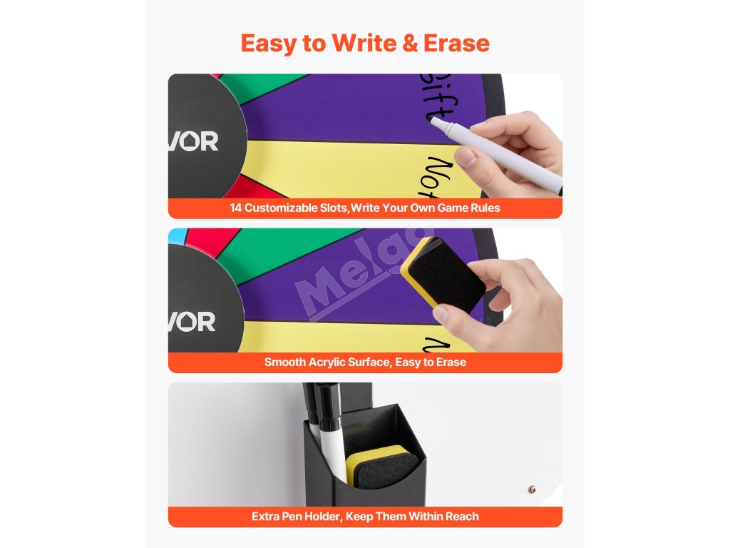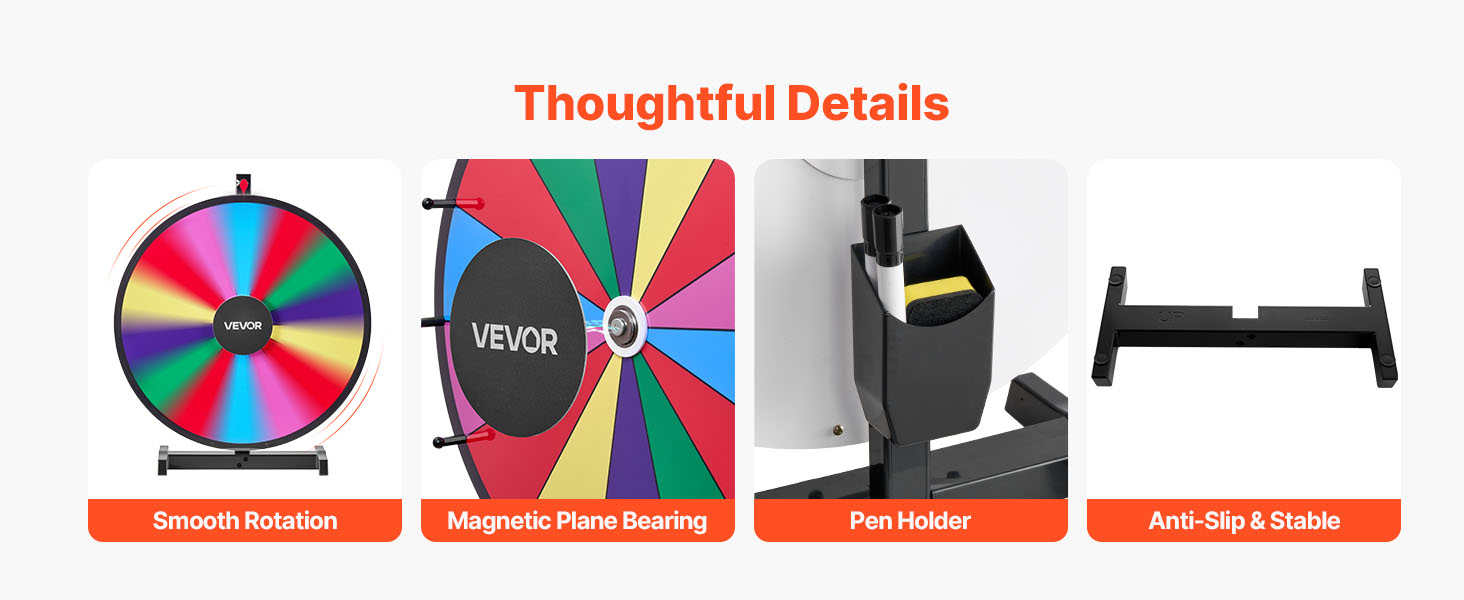 Hladké otáčanie s presným ložiskom a protišmykovou základňou zabezpečuje stabilné a bezpečné používanie. Točiace sa koliesko na výhry sa dodáva s držiakom na pero na jednoduché skladovanie.